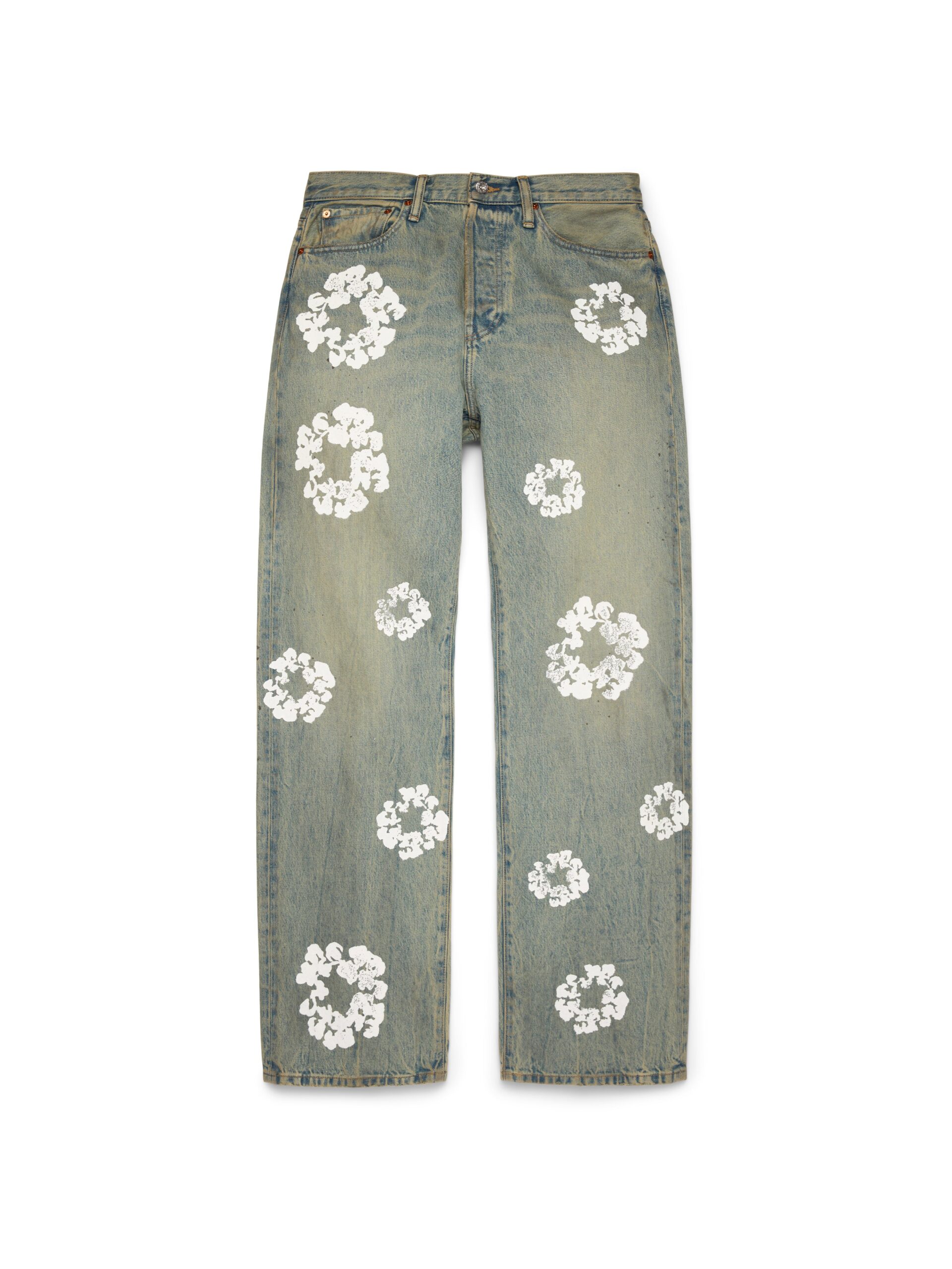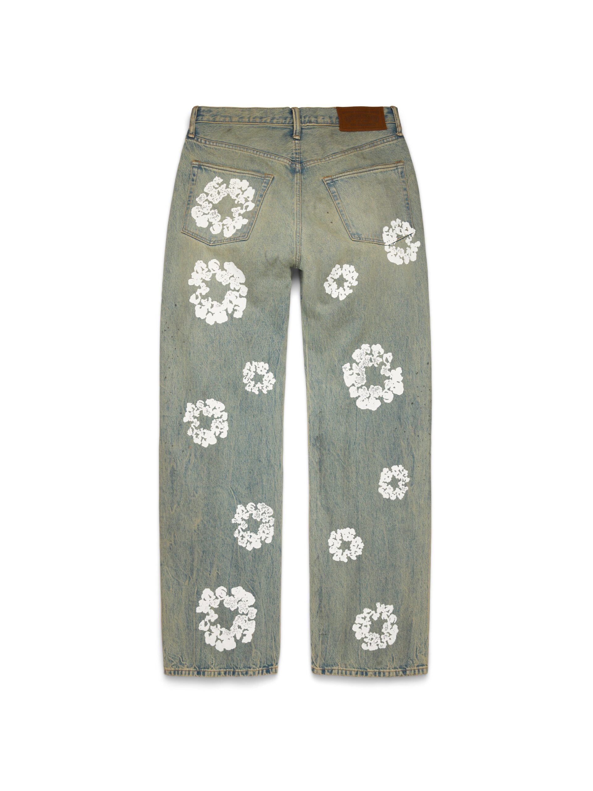 Constructed from heavyweight 14oz denim to a baggy fit, our Dirty Wash Baggy Cotton Wreath Denim Jeans are cut, sewn, and washed in the USA for uncompromised quality. Finished with custom antique nickel shank buttons and custom brass rivets.
