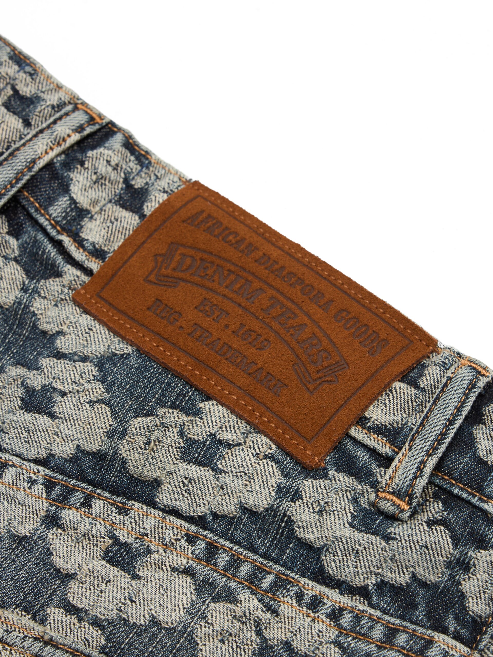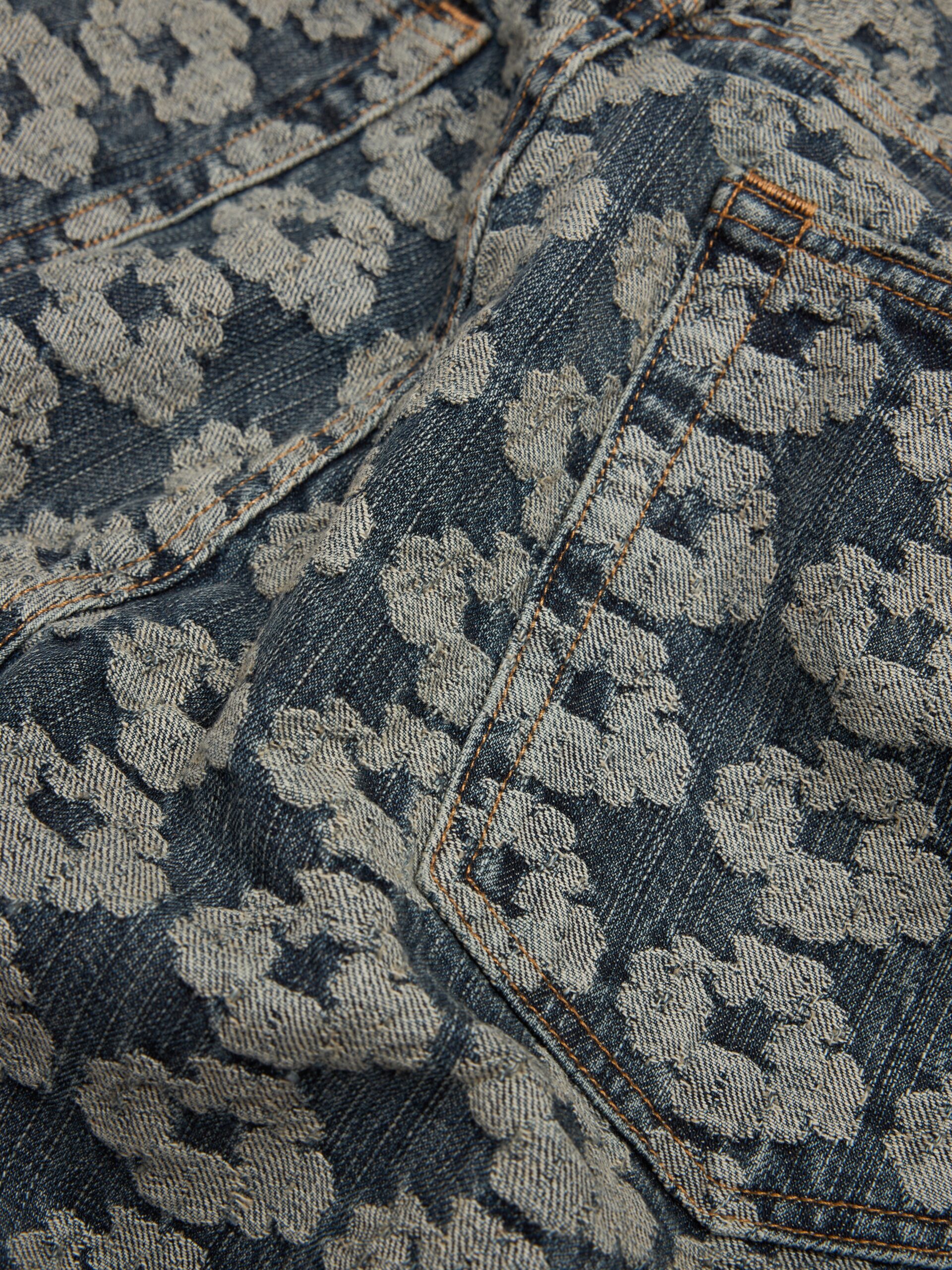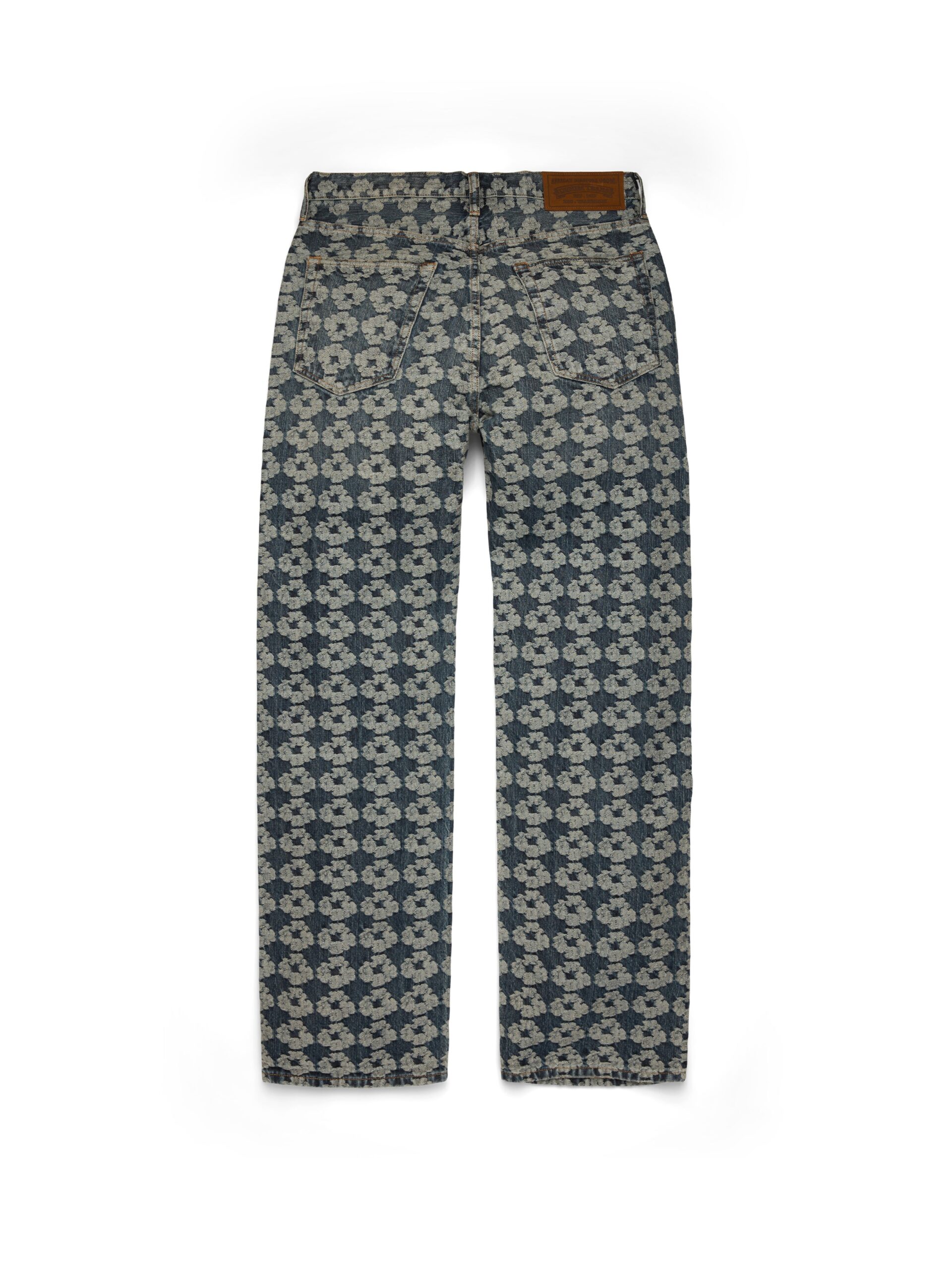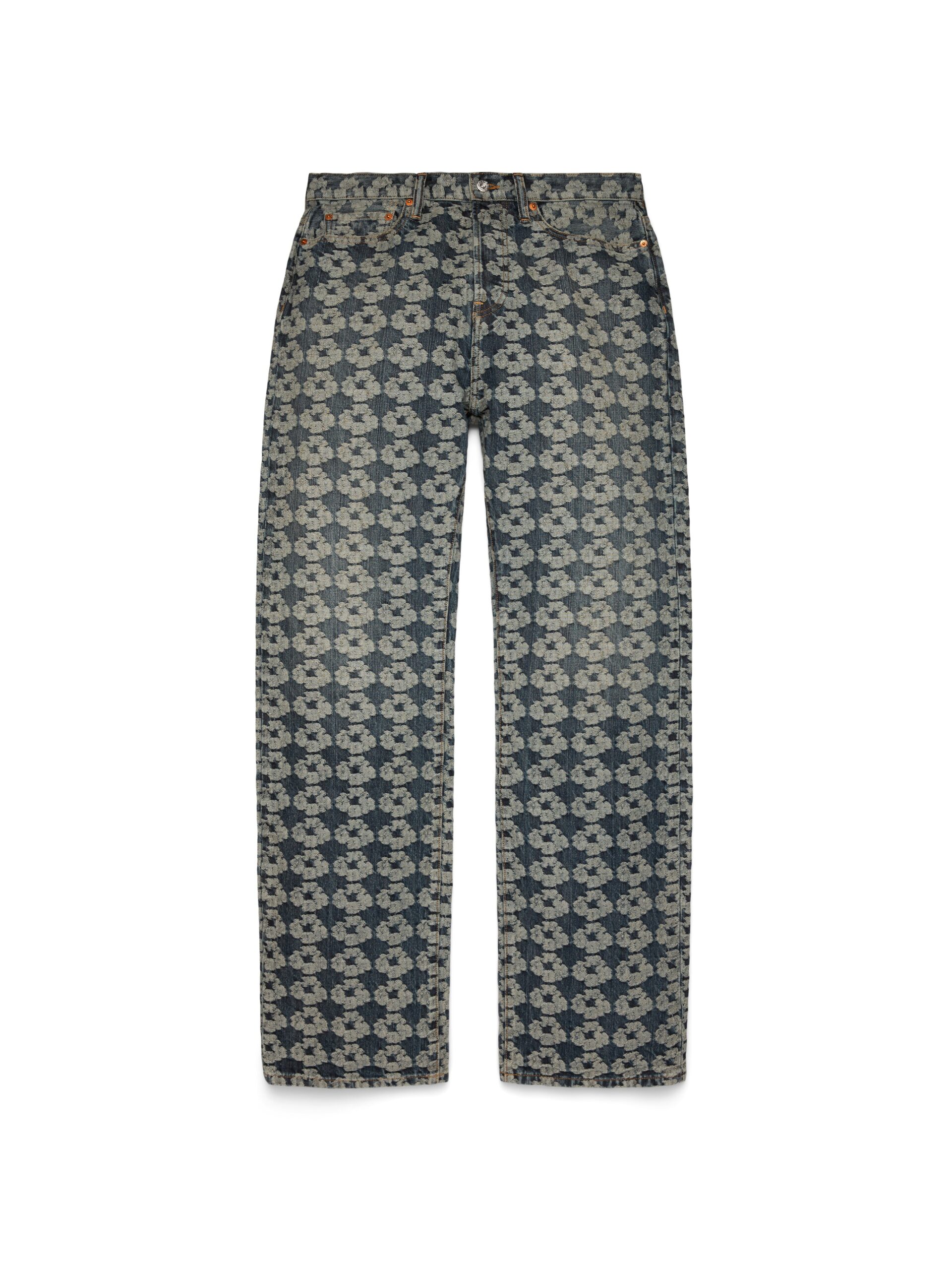 Constructed from heavyweight 13oz denim to a baggy fit, our Baggy Jacquard Wreath Denim Pants are cut, sewn, and washed in the USA for uncompromised quality. Finished with an all-over signature Cotton Wreath jacquard knit crafted from a custom Italian fabric, custom antique nickel shank buttons, and custom brass rivets.