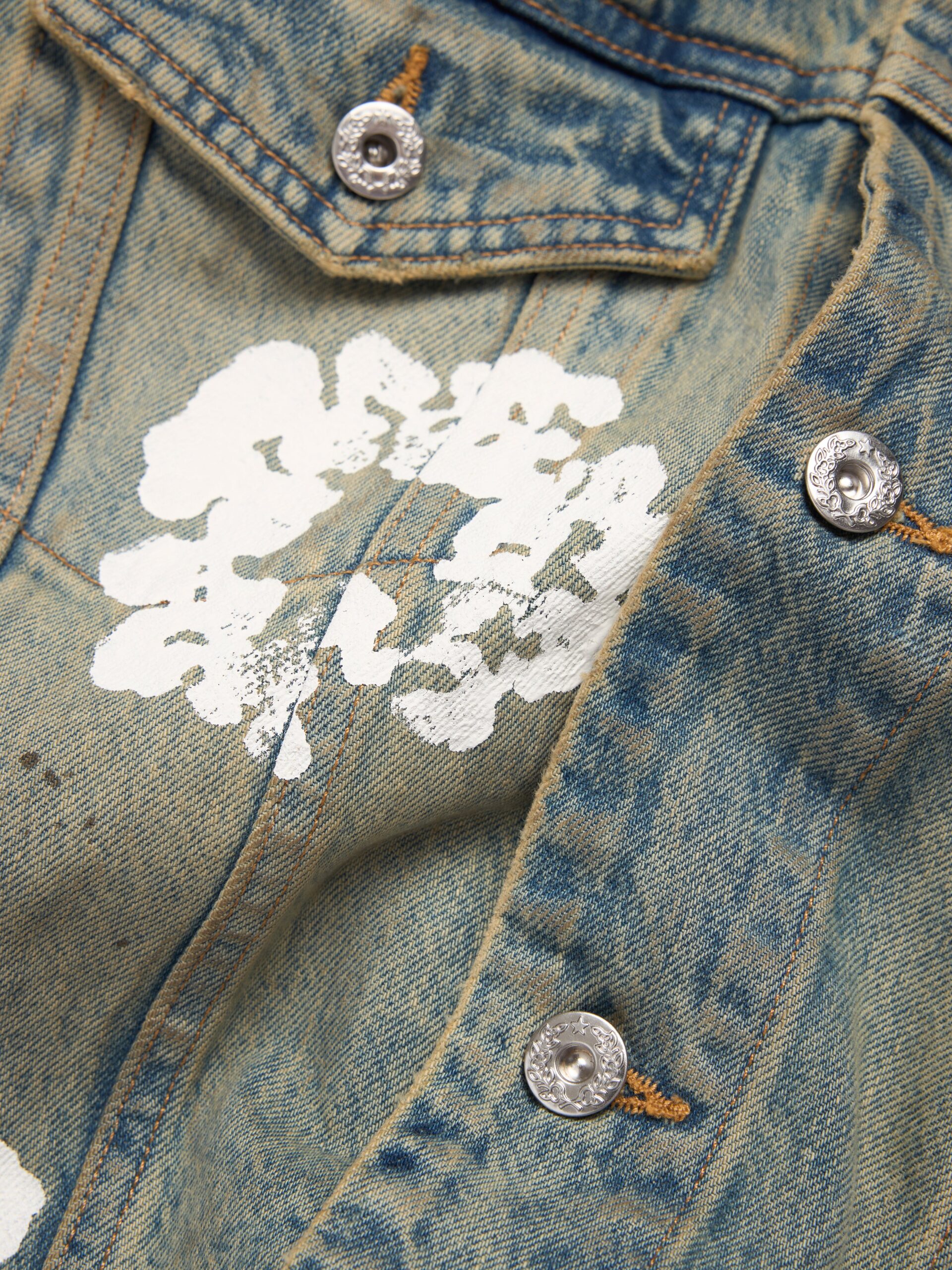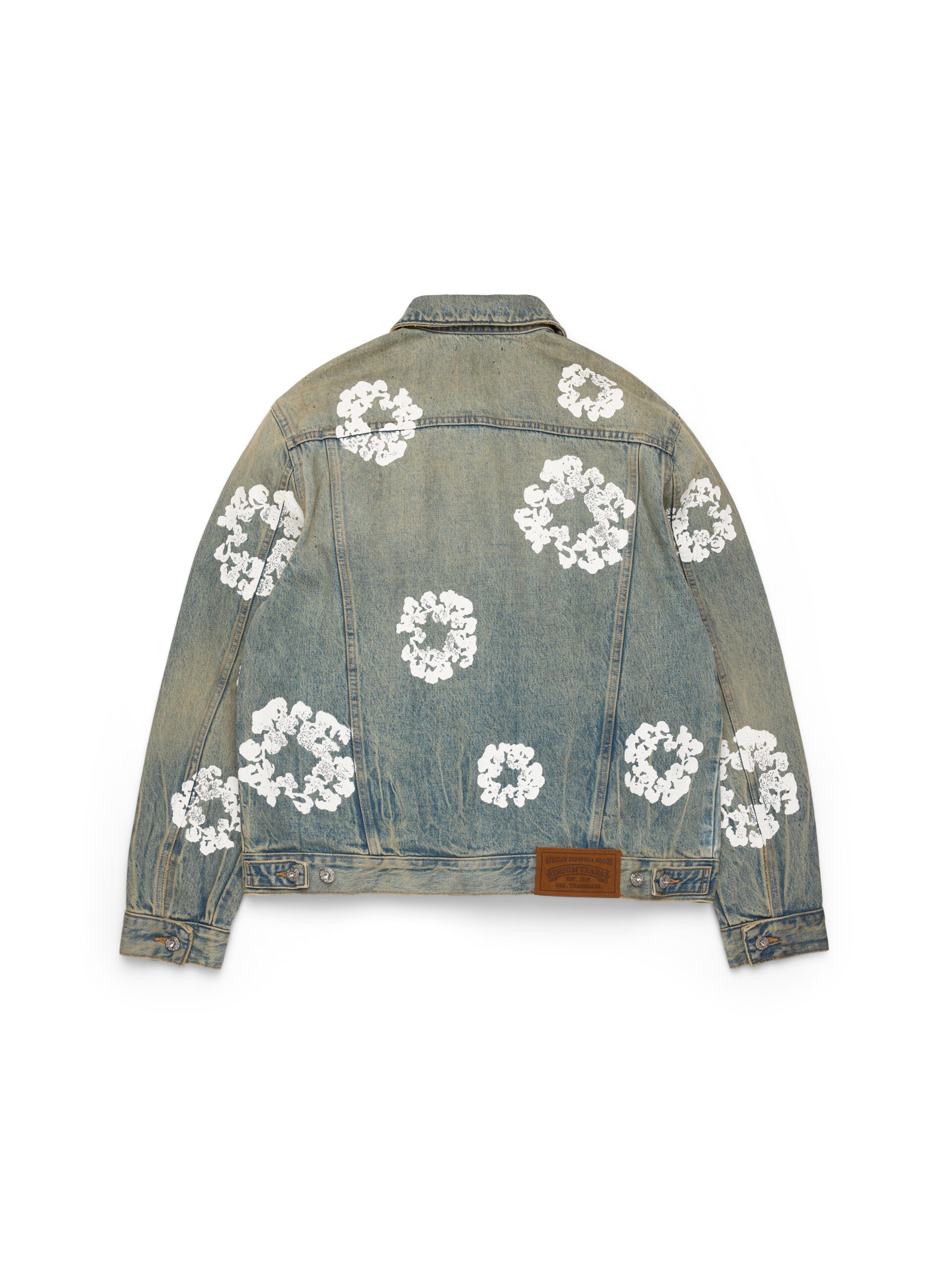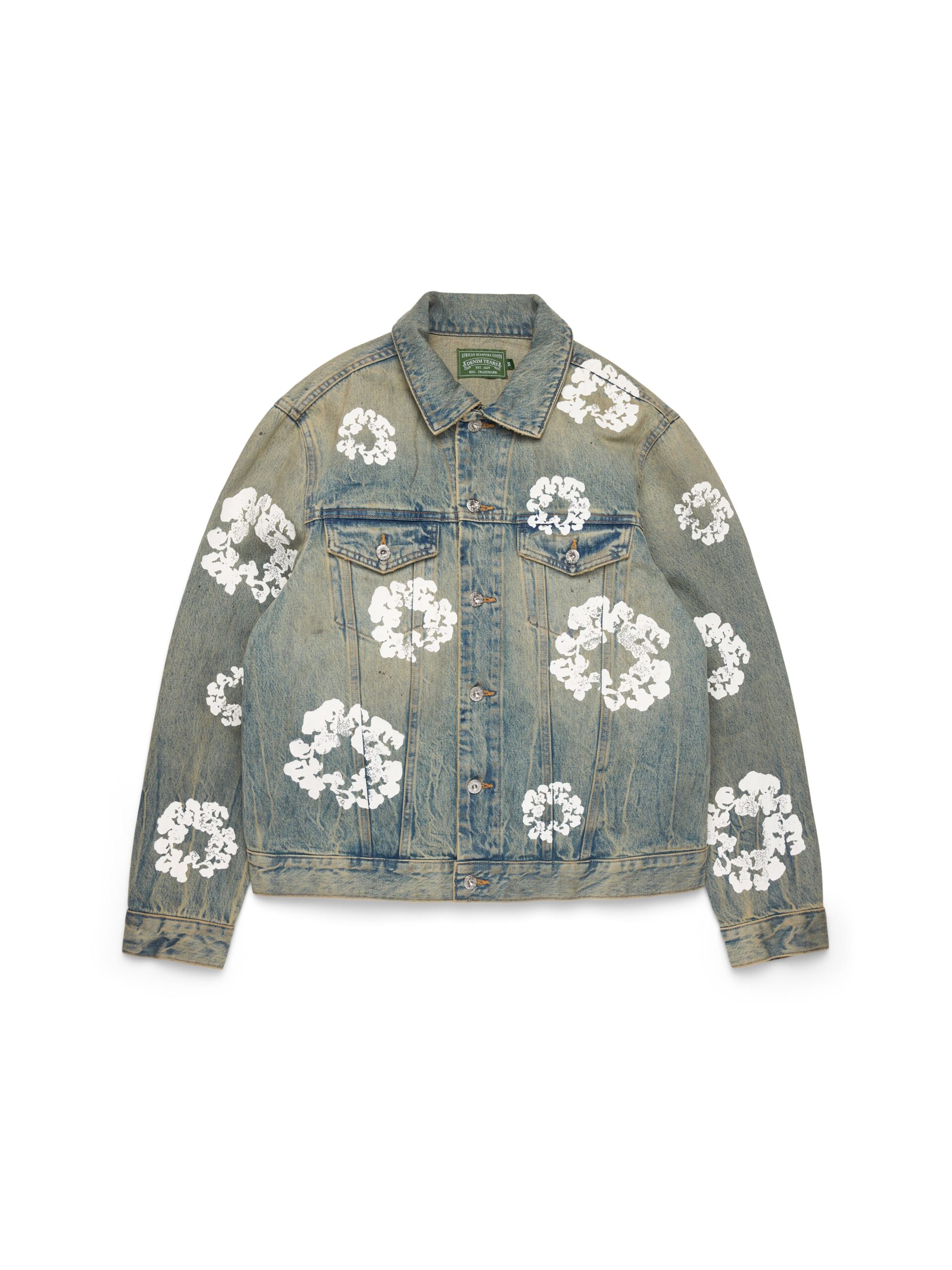 Constructed from heavyweight 14oz denim to a regular fit, our Dirty Wash Cotton Wreath Denim Jacket is cut, sewn, and washed in the USA for uncompromised quality. Finished with antique nickel button closure, two button-down flap pockets to the chest, and an all-over signature Cotton Wreath print.