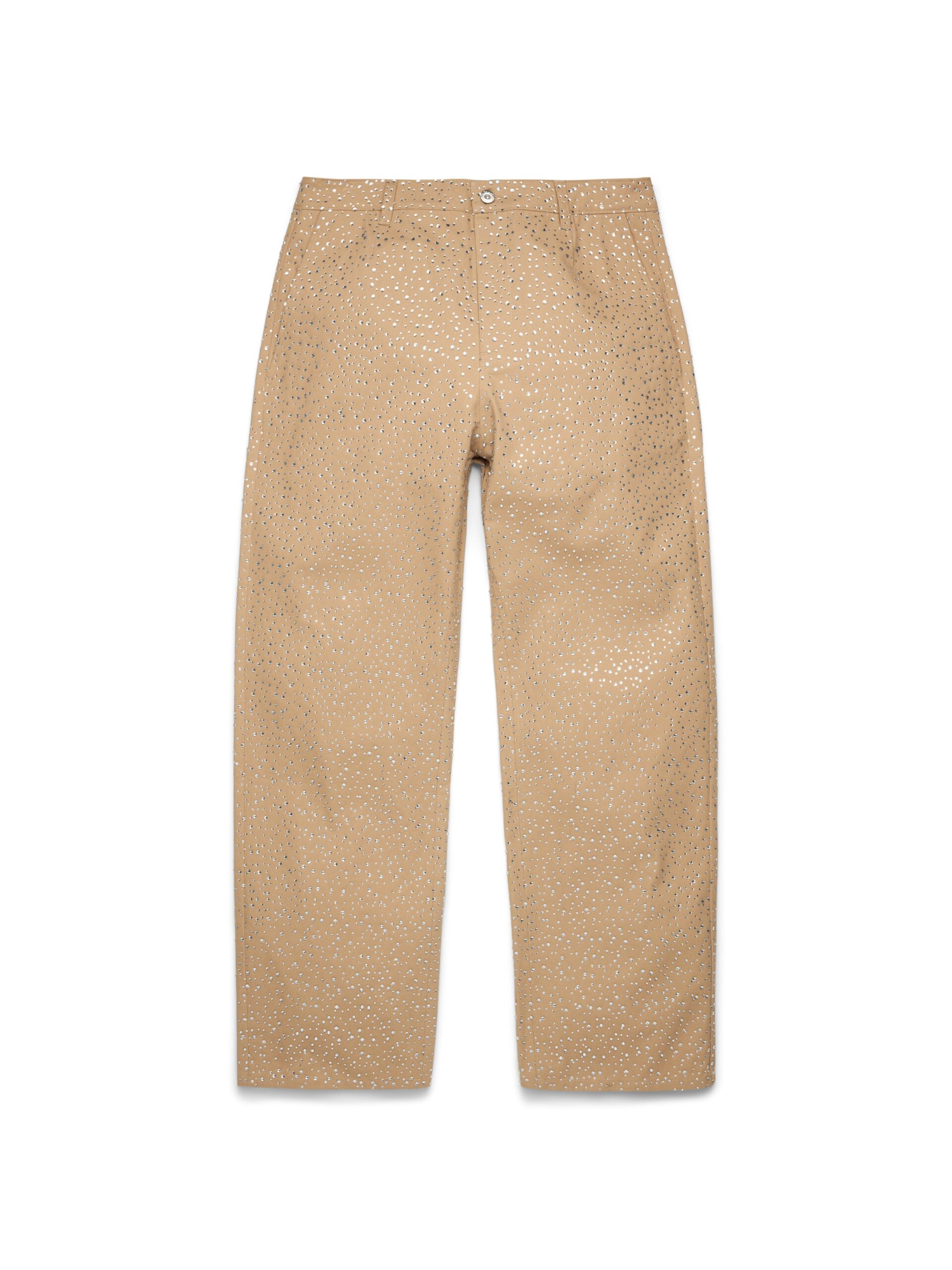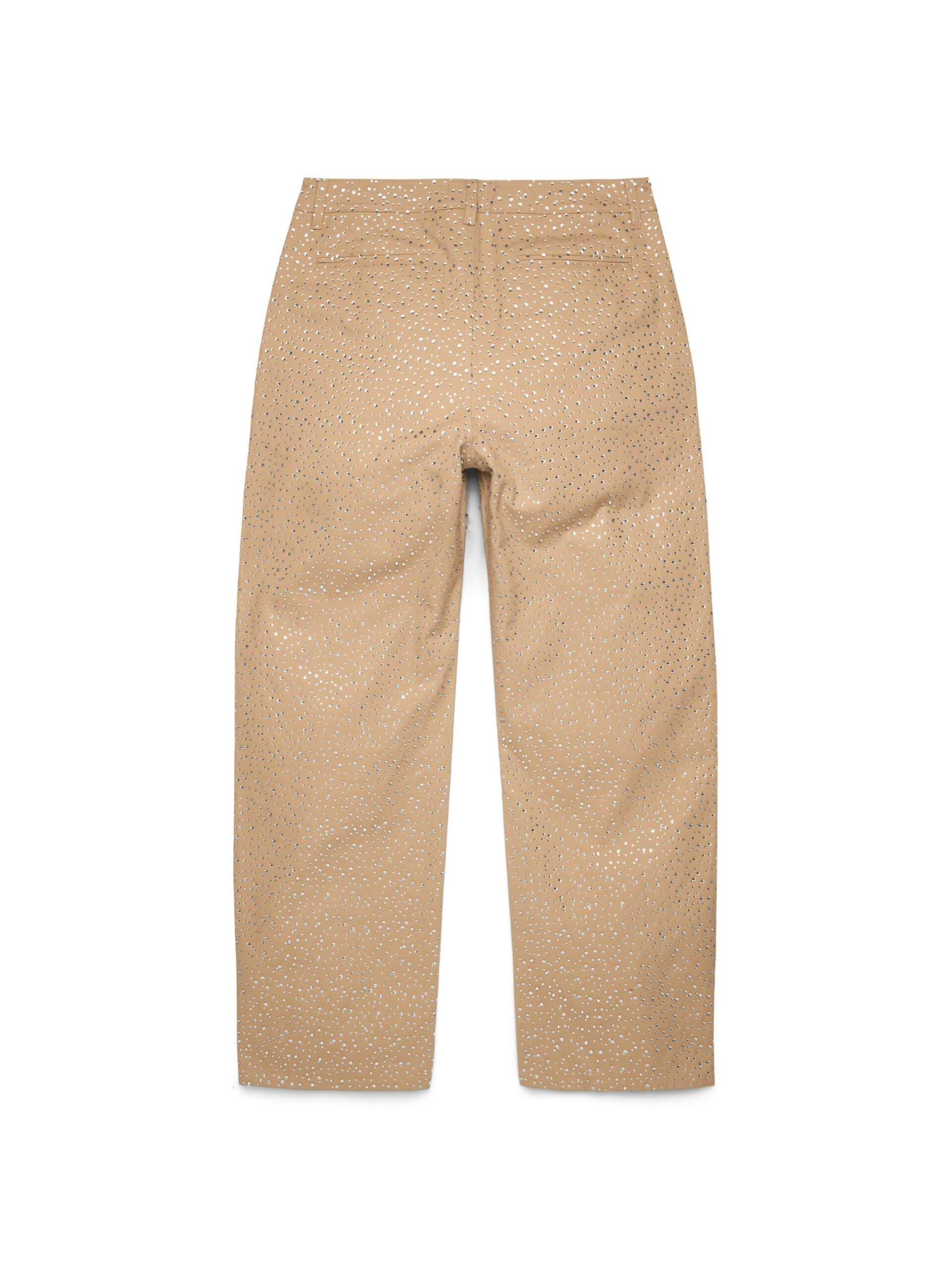 Produced in 100% Cotton and cut to a regular straight fit, our Crystal Chino Pants feature two rear jet pockets and two front slant pockets. Finished with a custom antique nickel Denim Tears zipper and crystal embellishment across the full length of the garment.