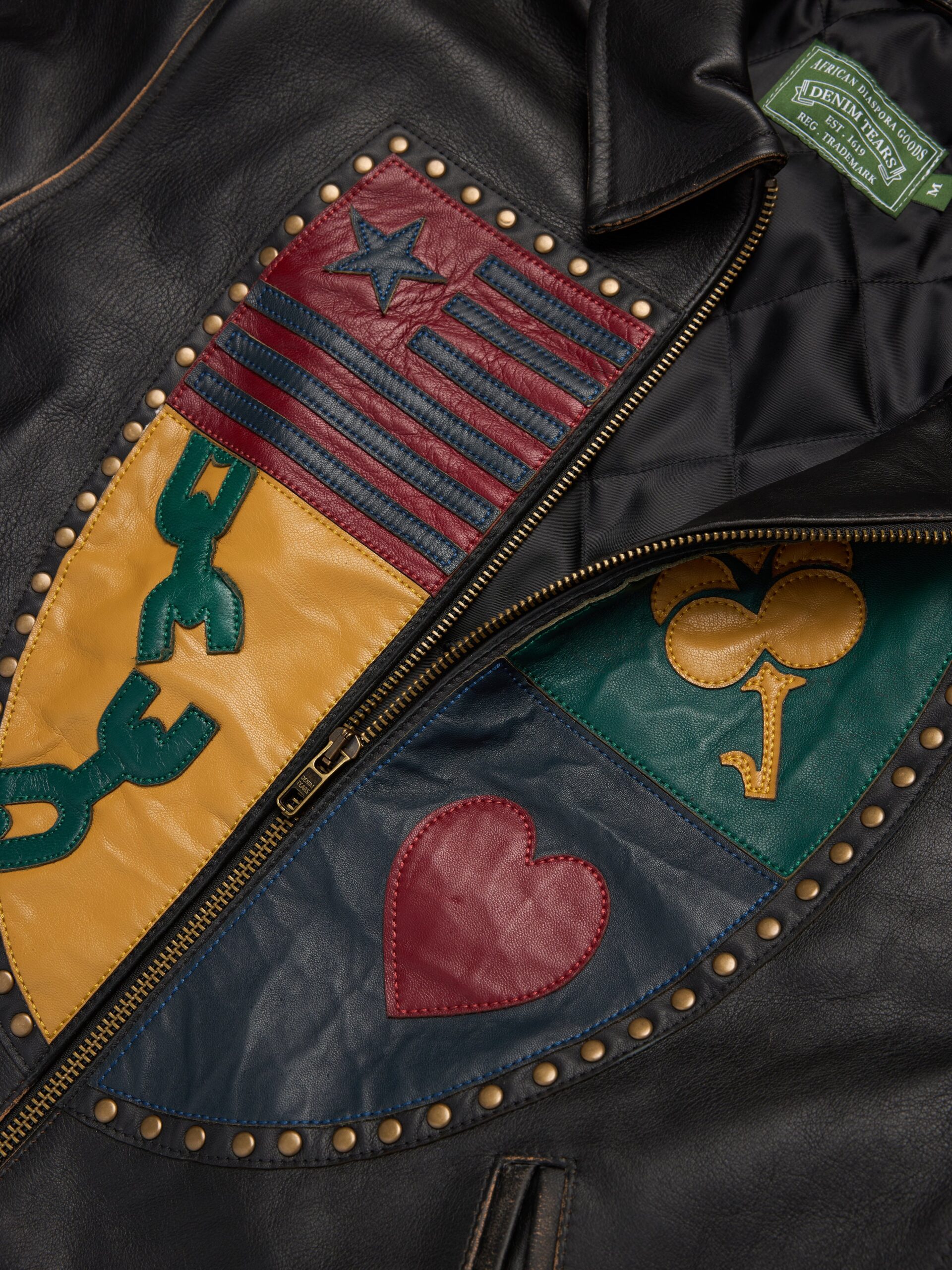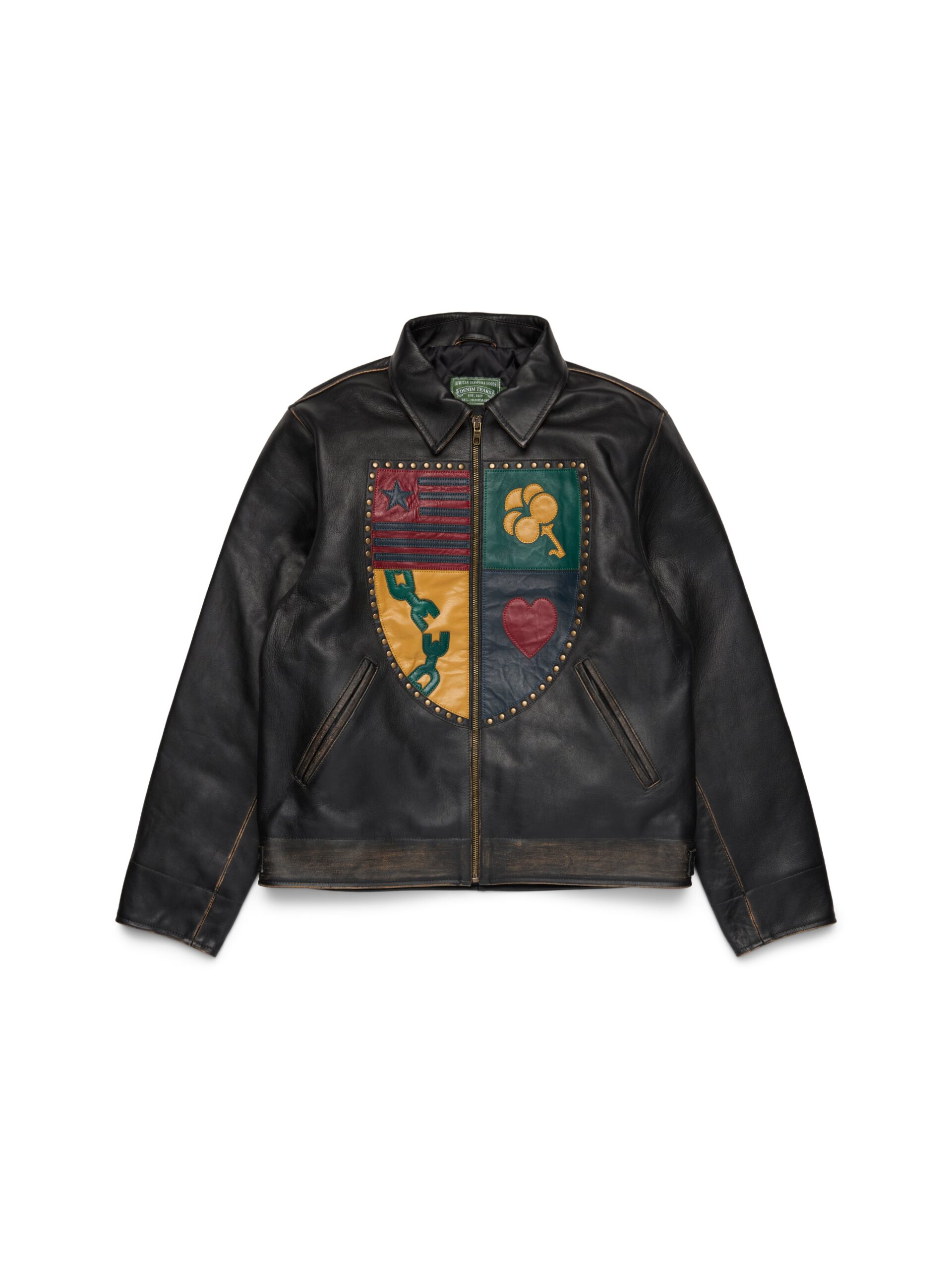 Produced in 100% leather, our Libertas Crest Leather Jacket features a full-sized DT Crest made up of key ‘Libertas’ motifs at the chest. Finished with antique brass studs and a custom antique nickel Denim Tears zipper.