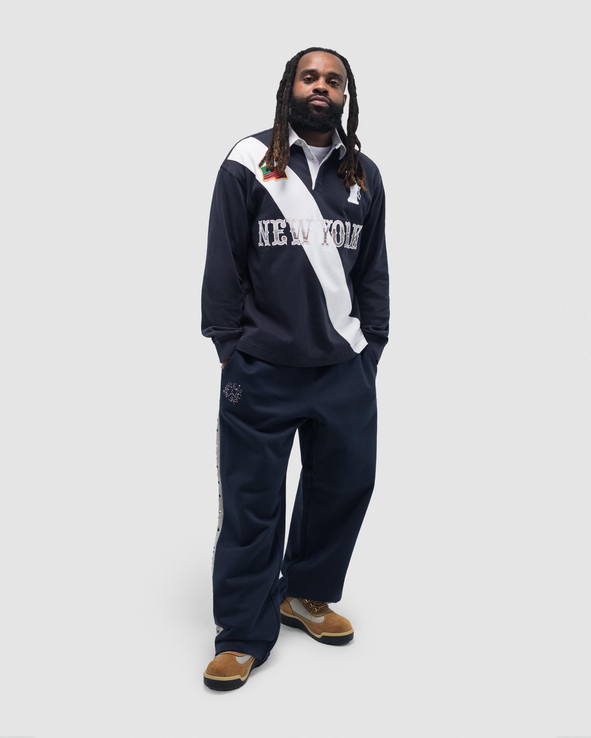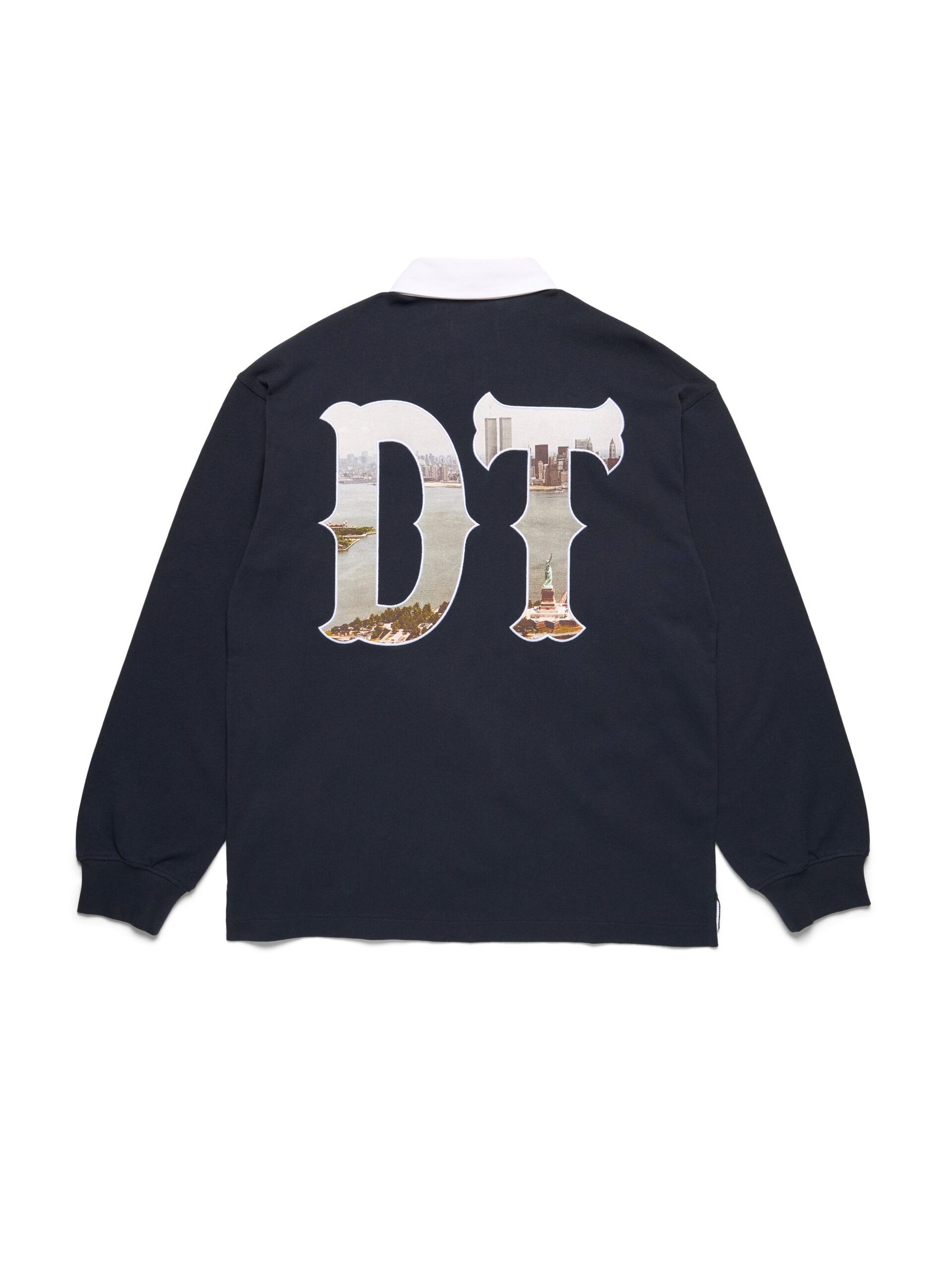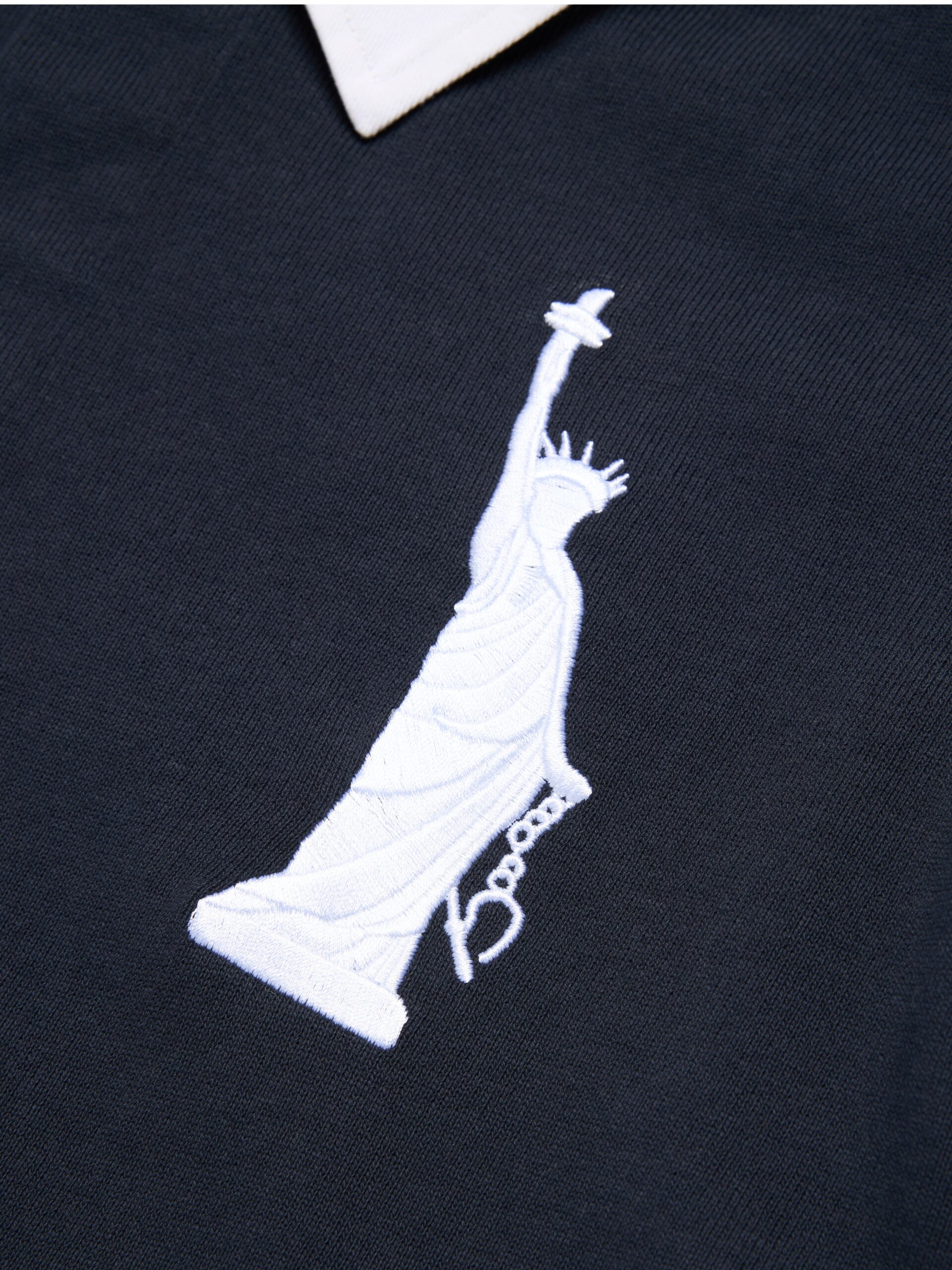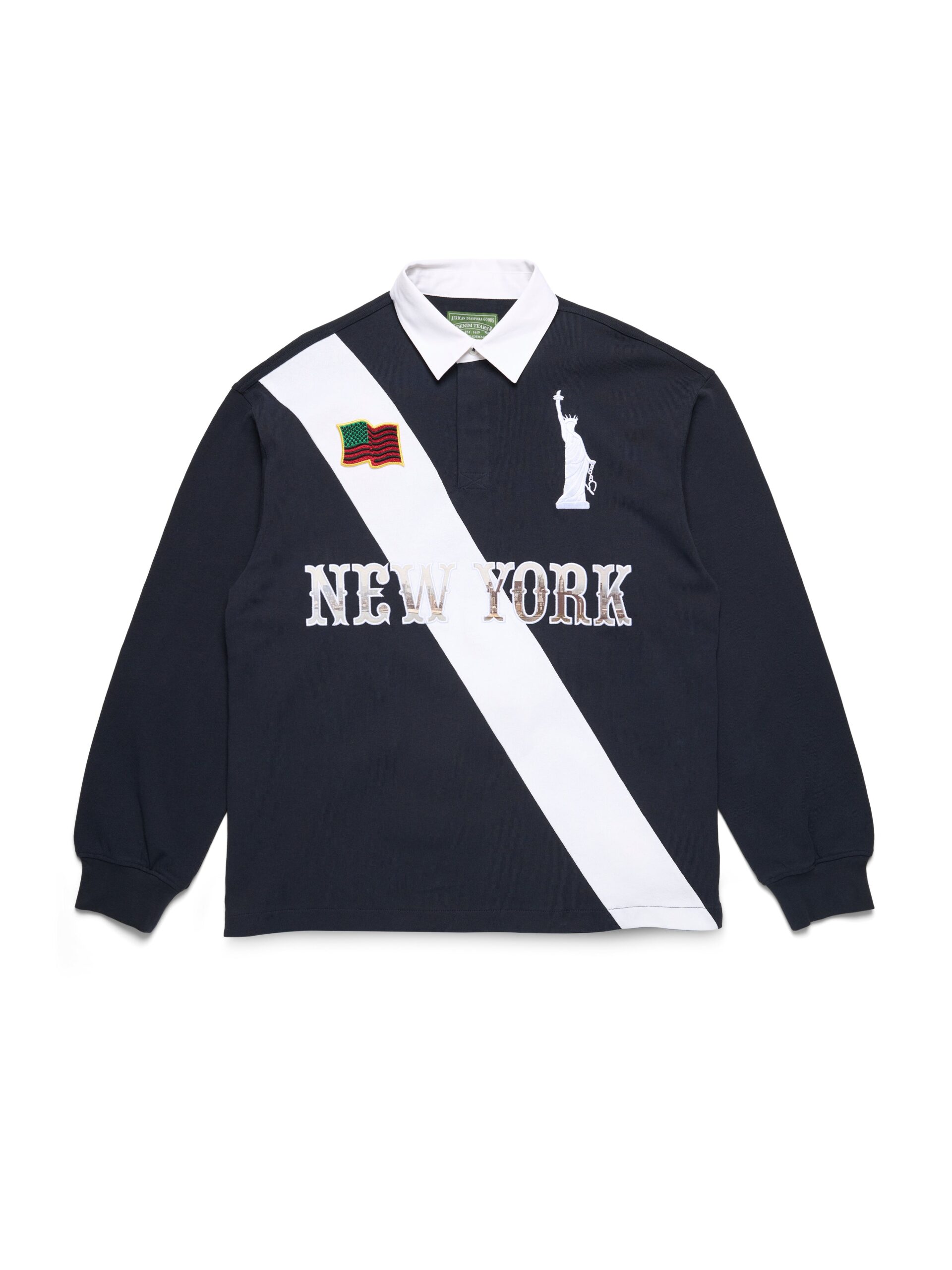 Produced in 100% heavyweight cotton and cut to a regular fit with a concealed button-up collar, our Lady Libertas  Rugby updates a classic silhouette with Libertas motifs, including an embroidered ‘Libertas’ Lady Liberty, 1886 – the year of the statue’s dedication – a Denim Tears New York spellout photo appliqué, and a Pan-African American Flag embroidered patch.