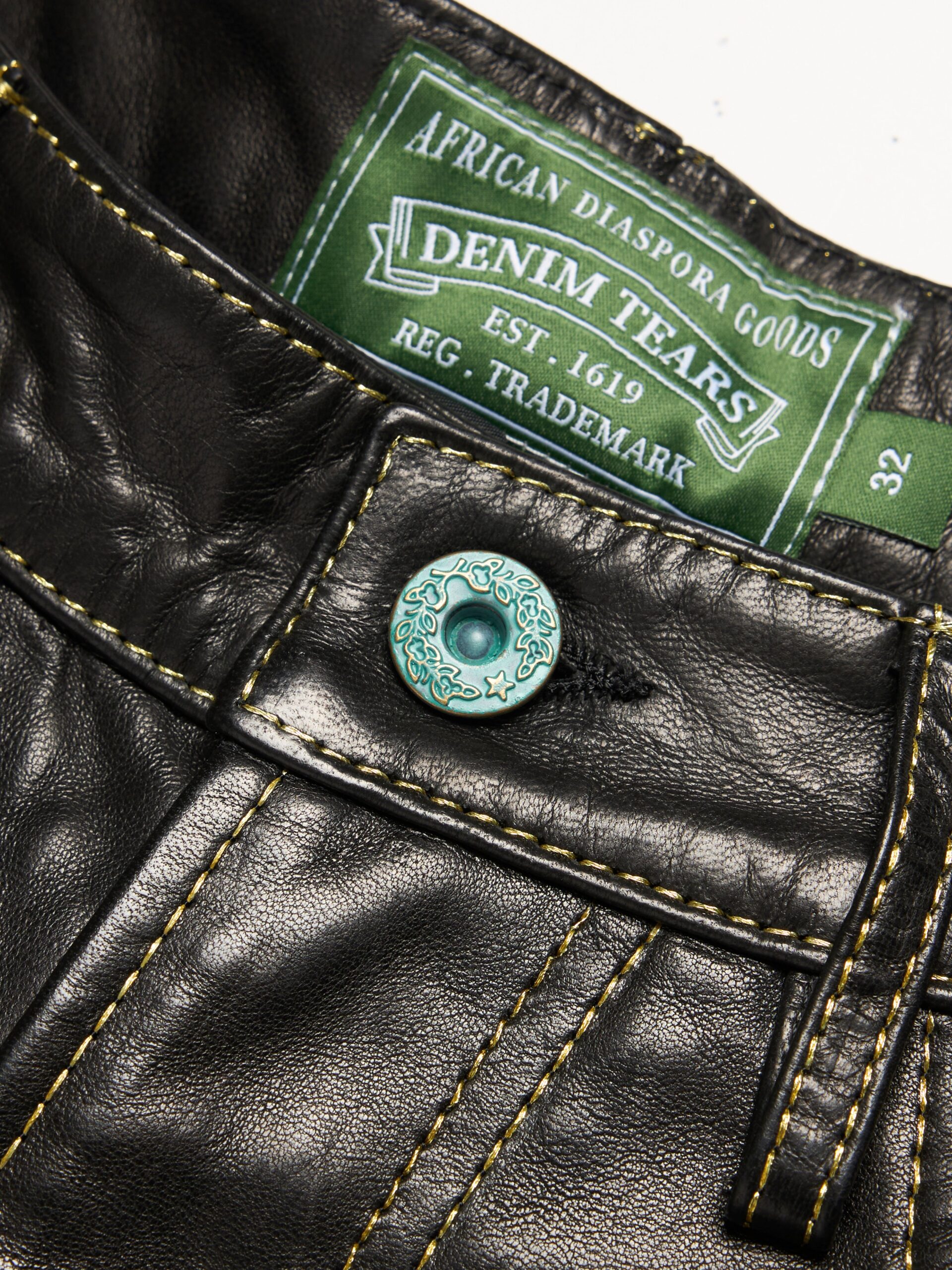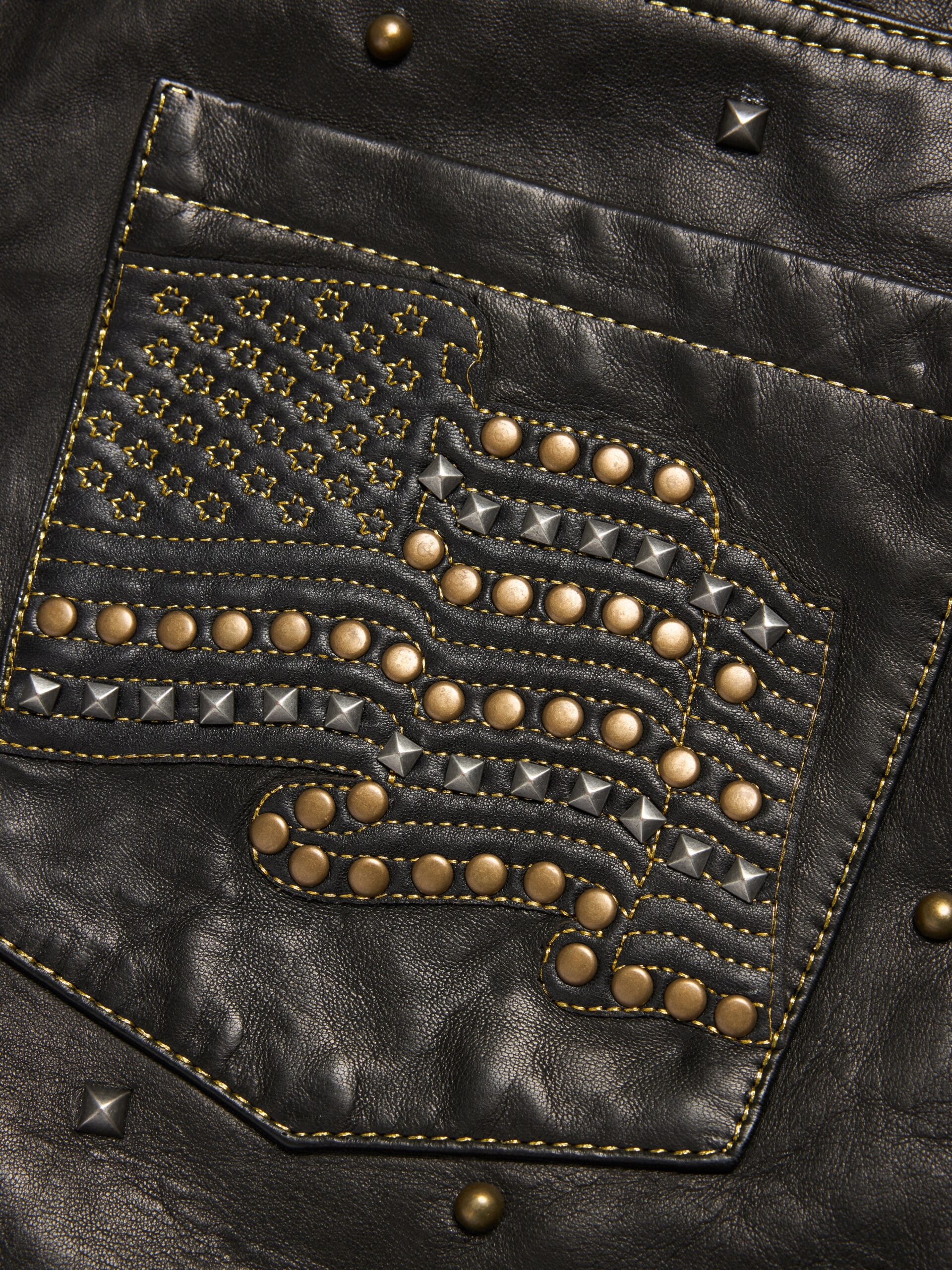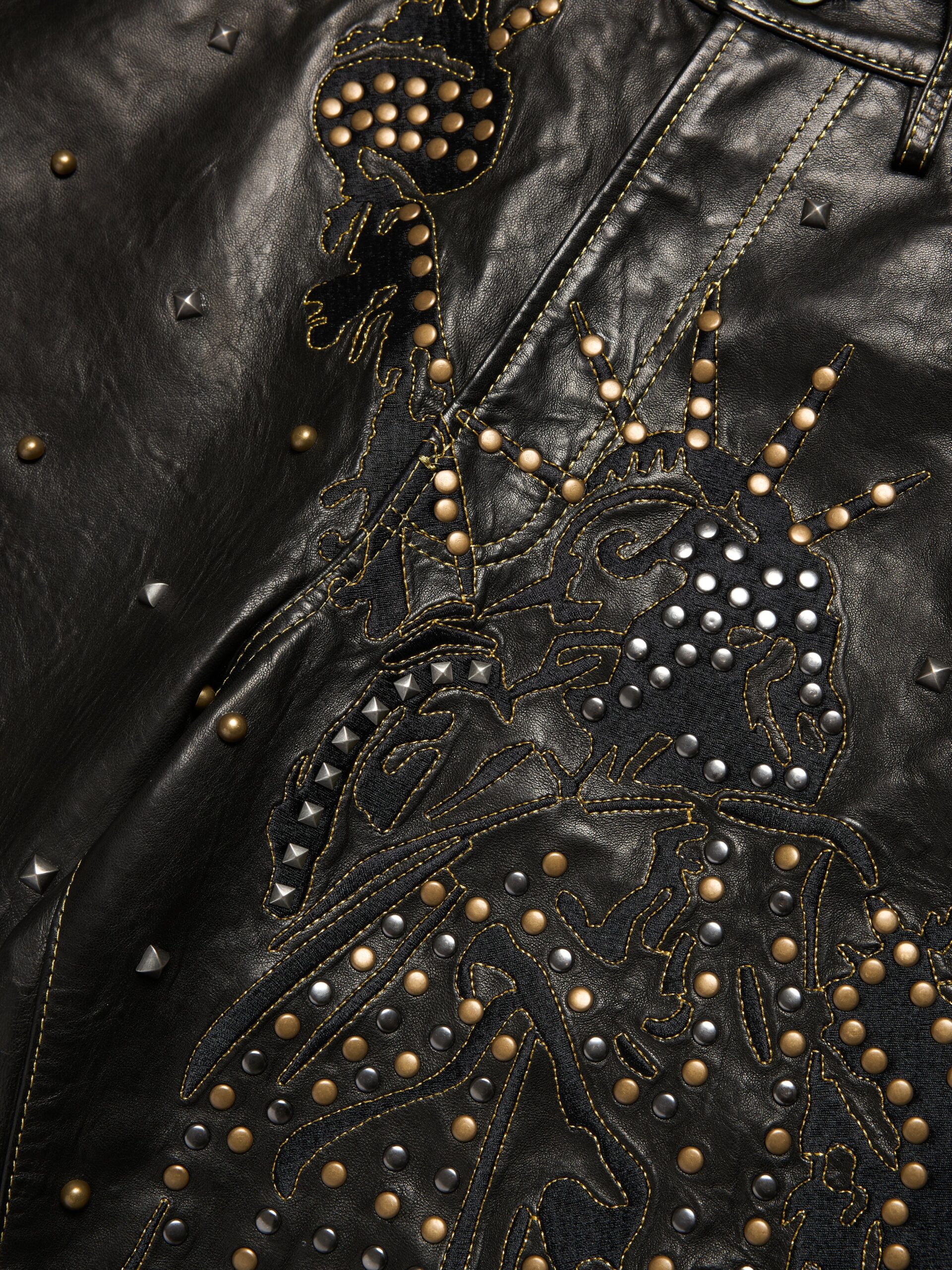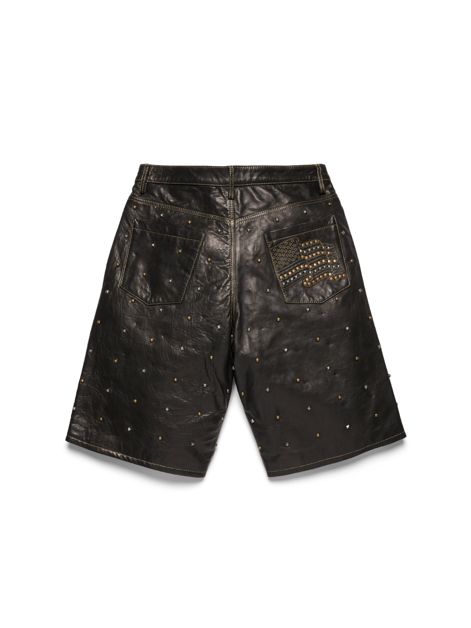 Produced in 100% leather and cut to the same fit as our Denim Shorts, our Lady Libertas  Studded Leather Shorts feature statement brass and oxidized stud appliqué throughout. On the front, the studs form the ‘Libertas’ Lady Liberty and DT motif; on the rear pocket, the US flag. Finished with gold thread embroidery.
