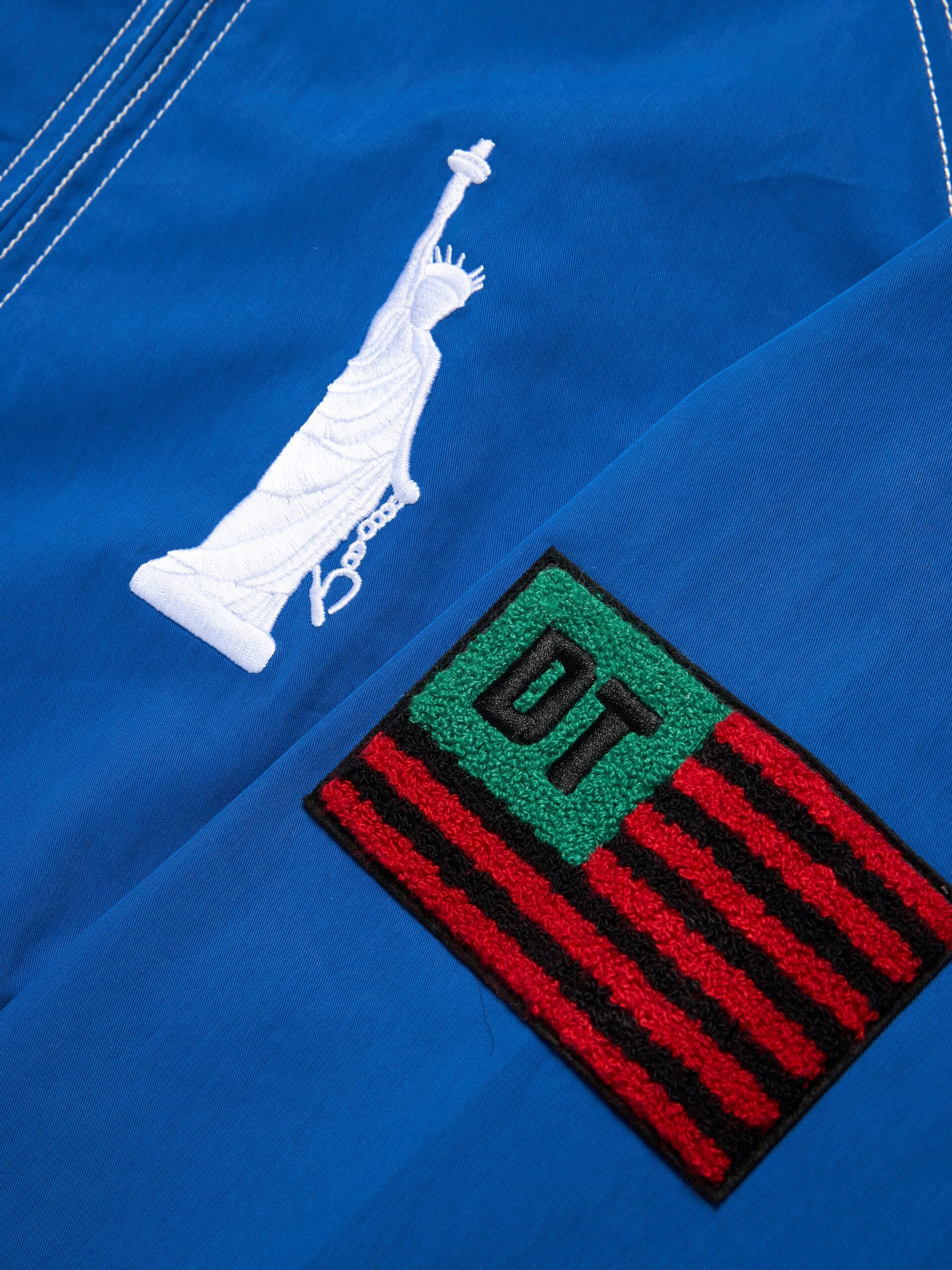 Constructed with a 100% cotton shell and cut to a regular fit, our Libertas  Zip Jacket features an embroidered chenille Pan-African American Flag patch and 1886 on the sleeves, and an embroidered Libertas at the chest. Finished with contrast stitching and a custom antique nickel Denim Tears zipper.