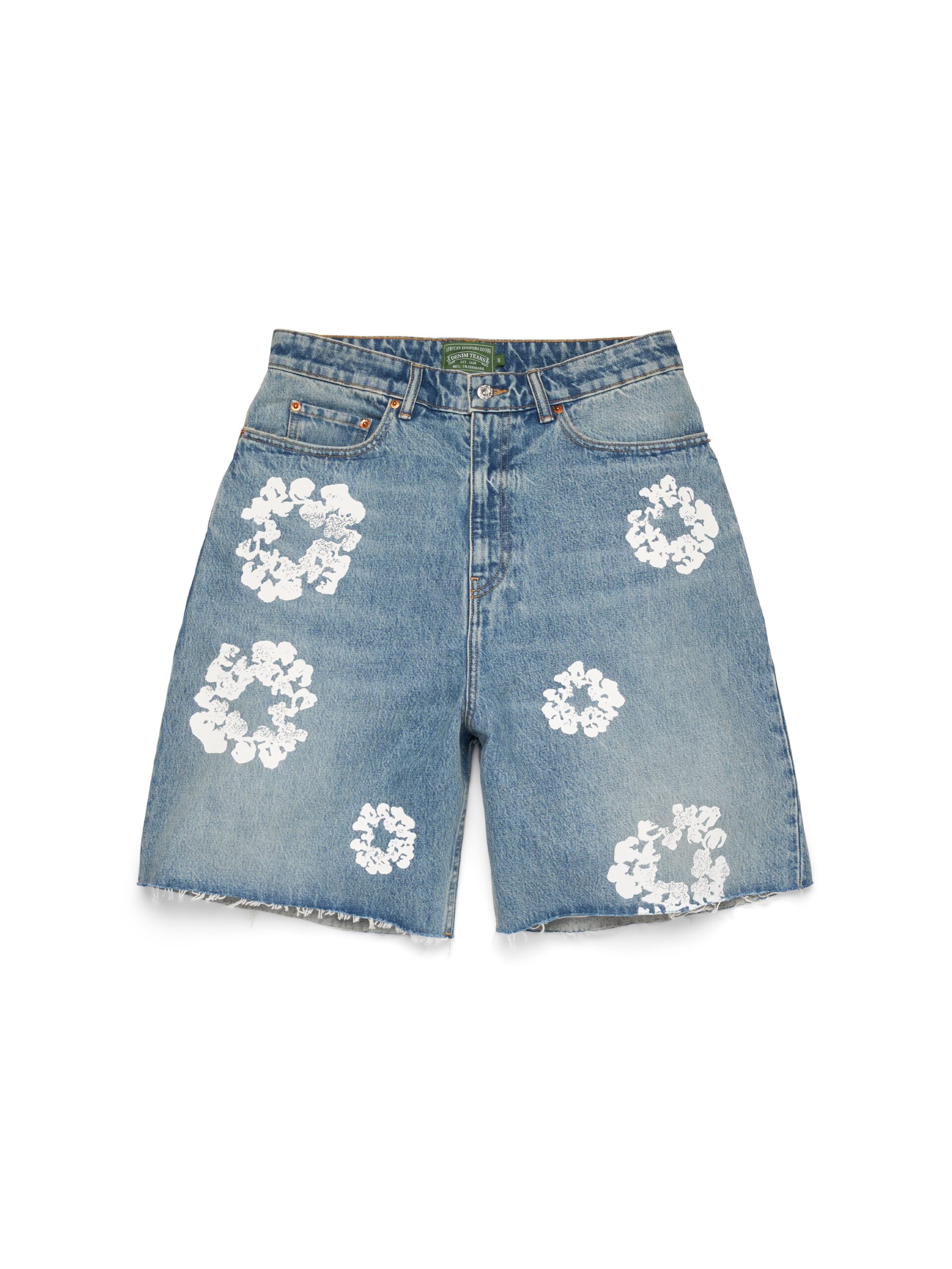 Constructed from heavyweight 14oz denim to a regular fit, our Light Wash Cotton Wreath Denim Shorts are cut, sewn, and washed in the USA for uncompromised quality. Finished with an all-over signature Cotton Wreath print and custom antique nickel shank buttons.