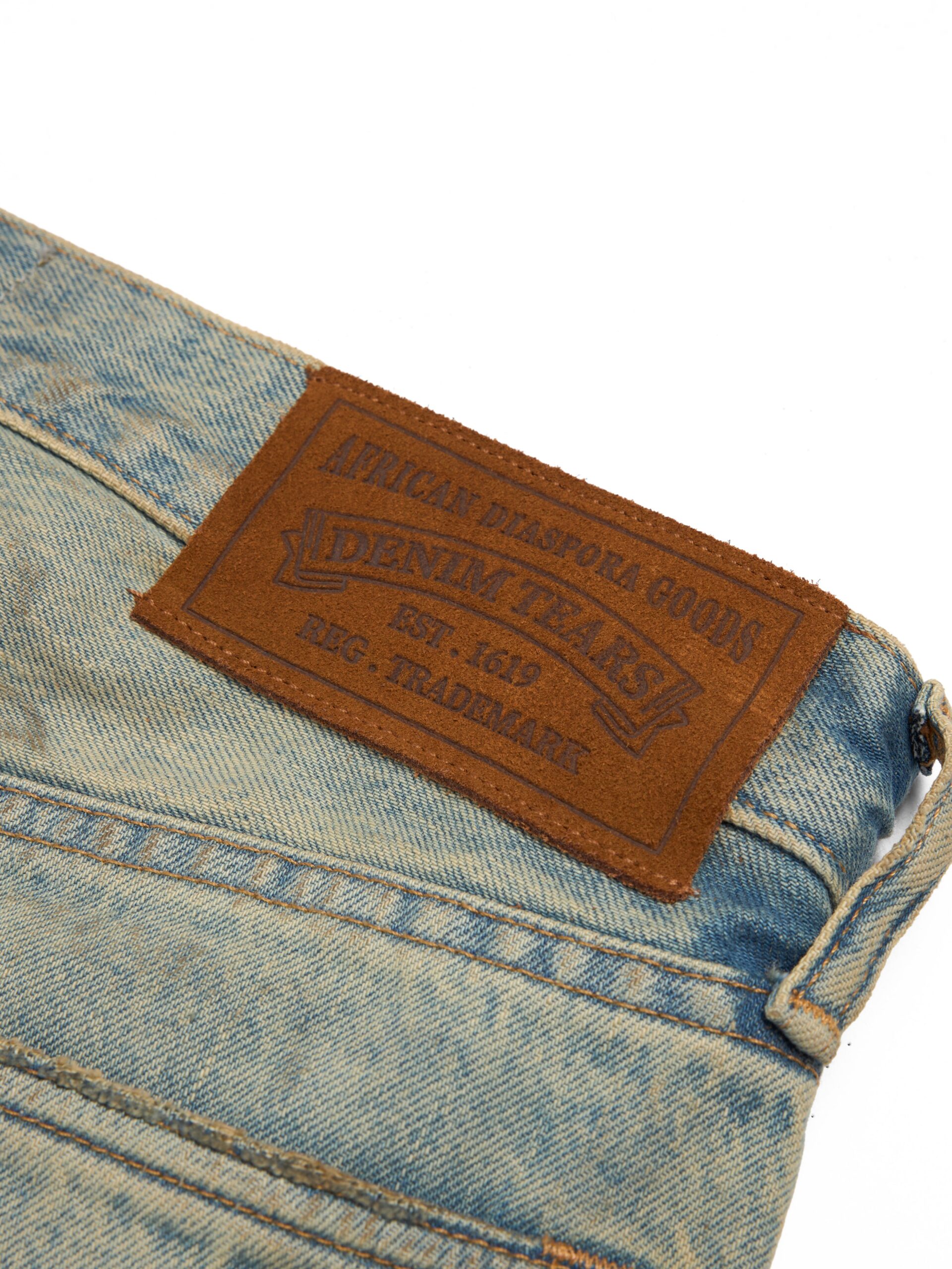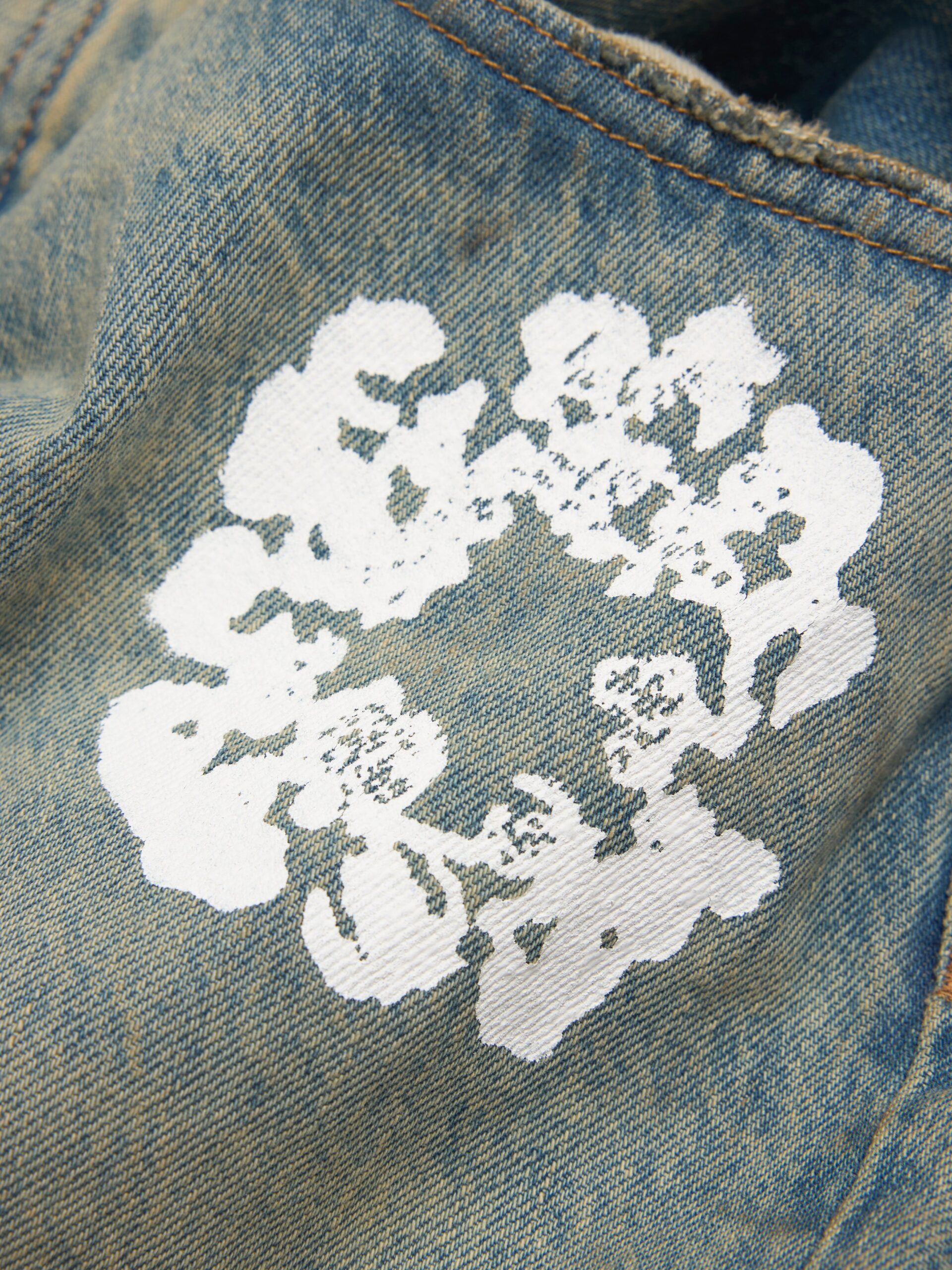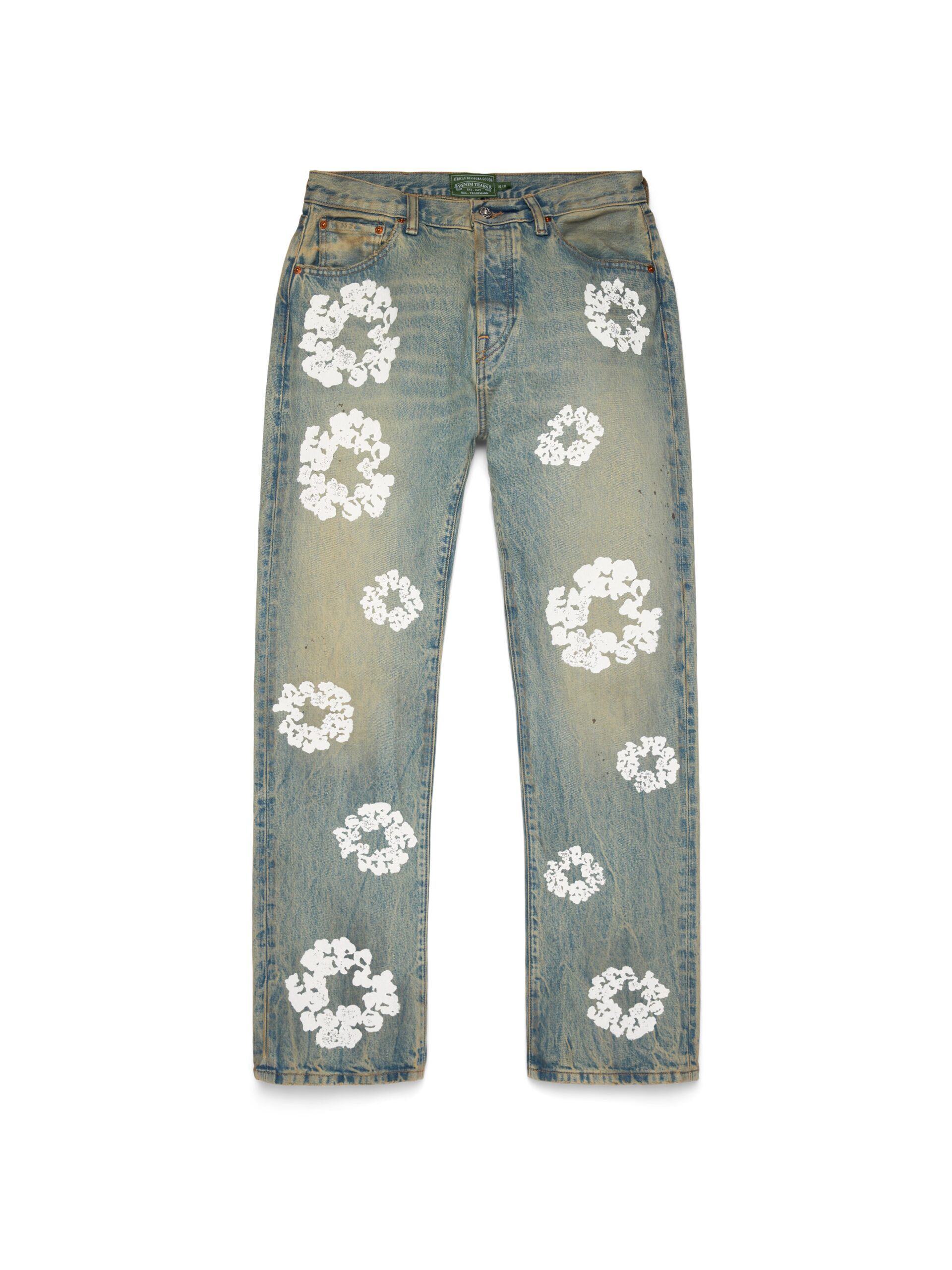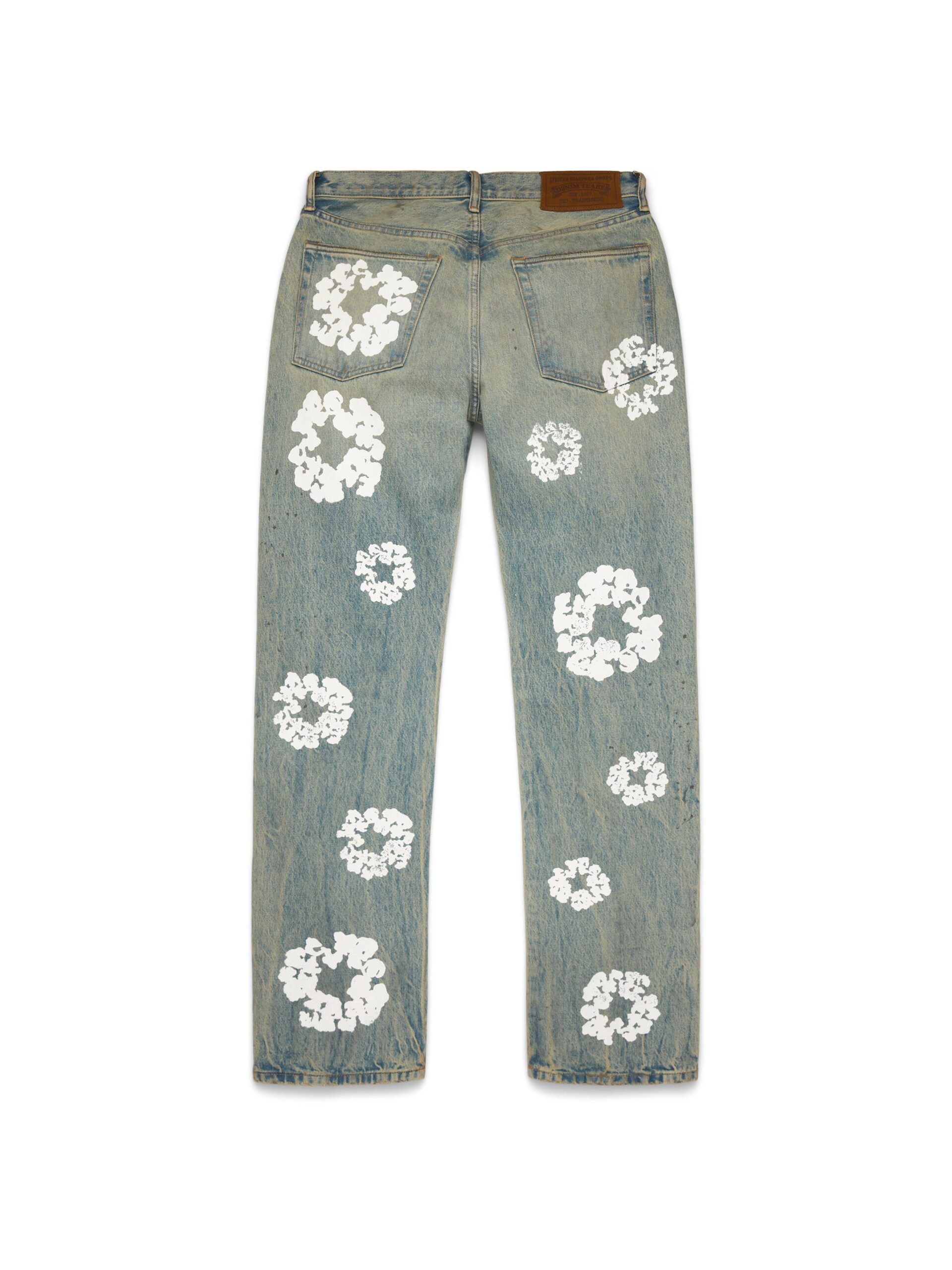 Constructed from heavyweight 14oz denim to a classic straight fit, our Straight Dirty Wash Cotton Wreath Denim Pants are cut, sewn, and washed in the USA for uncompromised quality. Finished with an all-over signature Cotton Wreath print, custom antique nickel shank buttons, and custom brass rivets.
