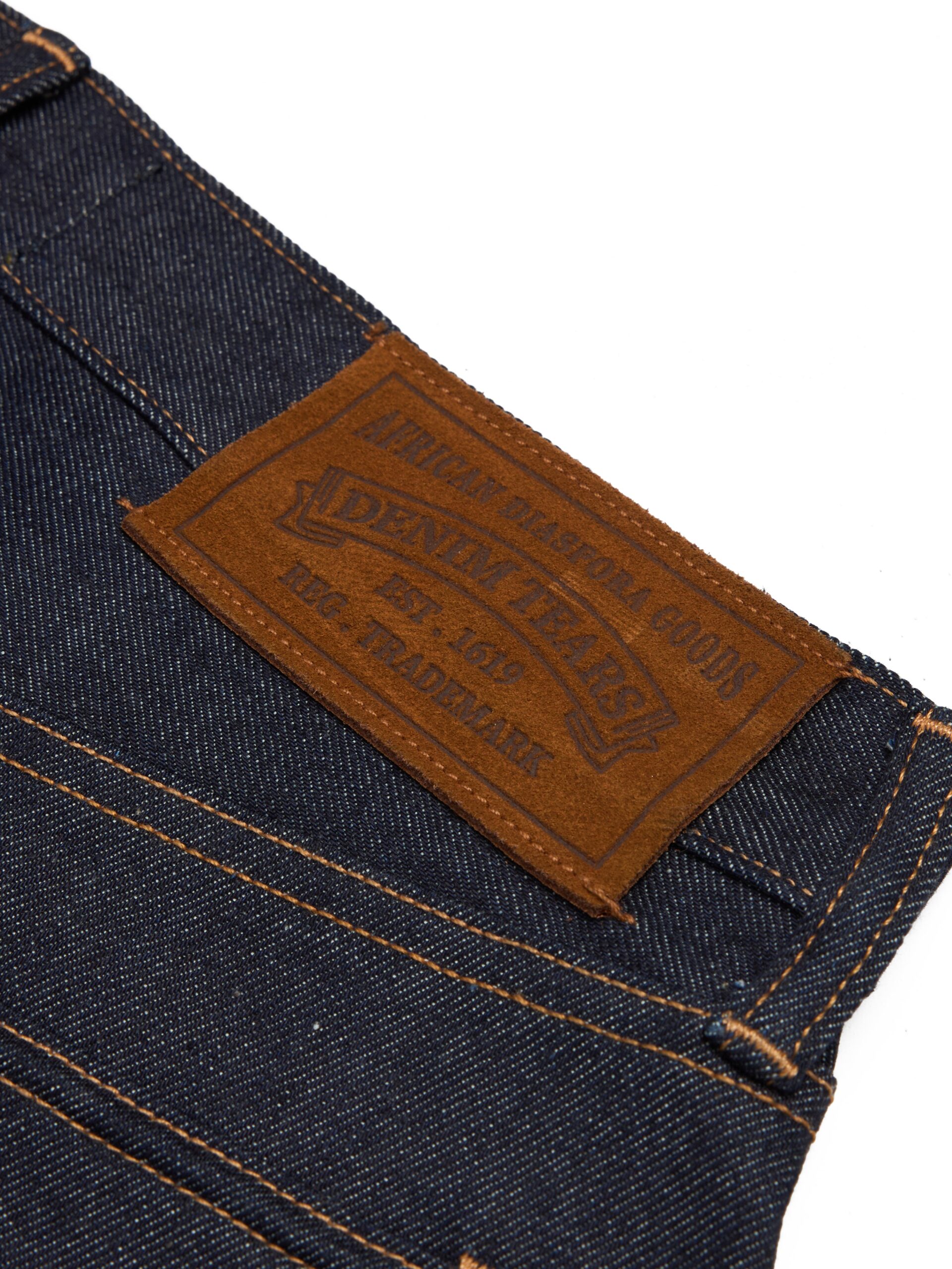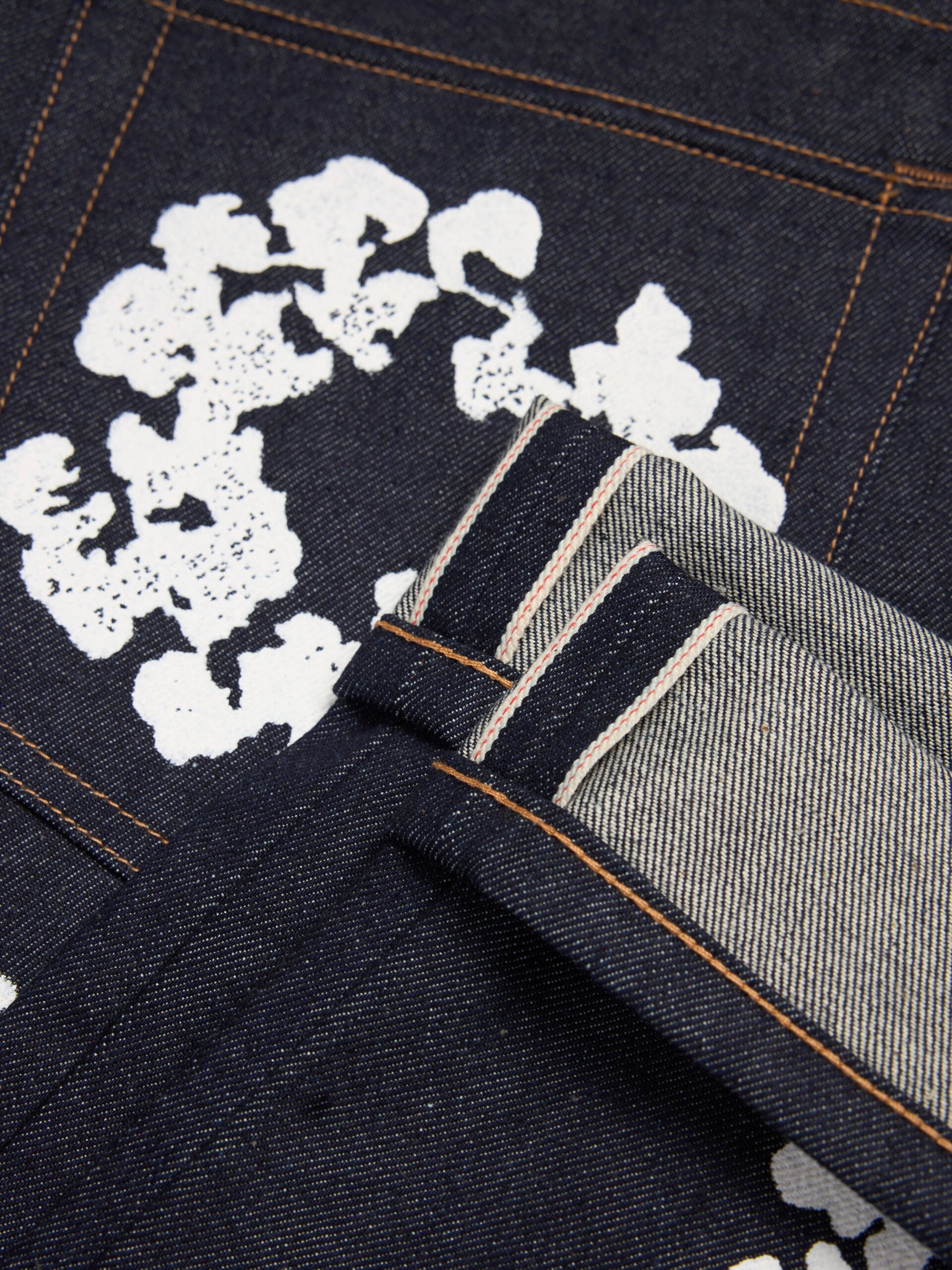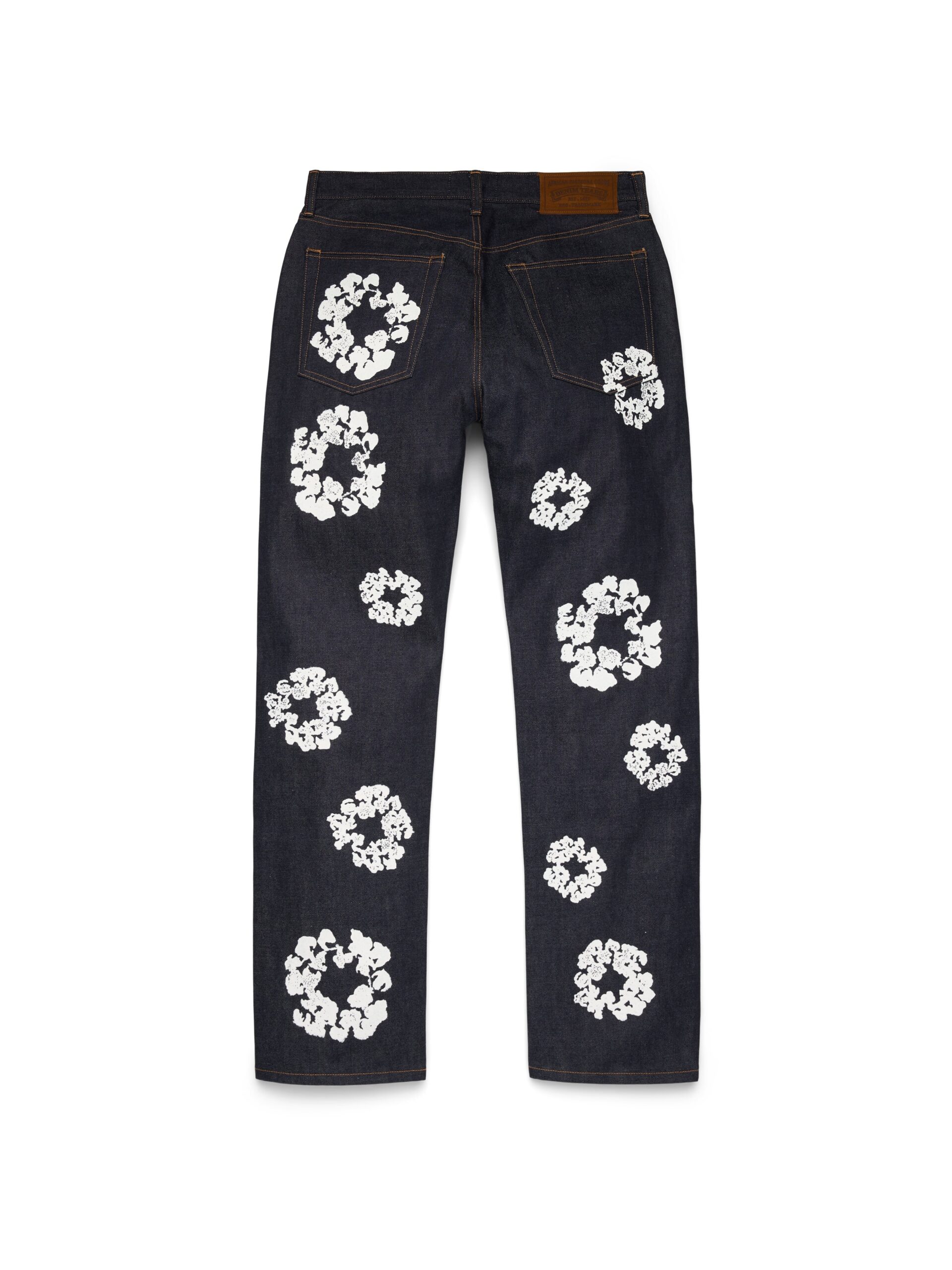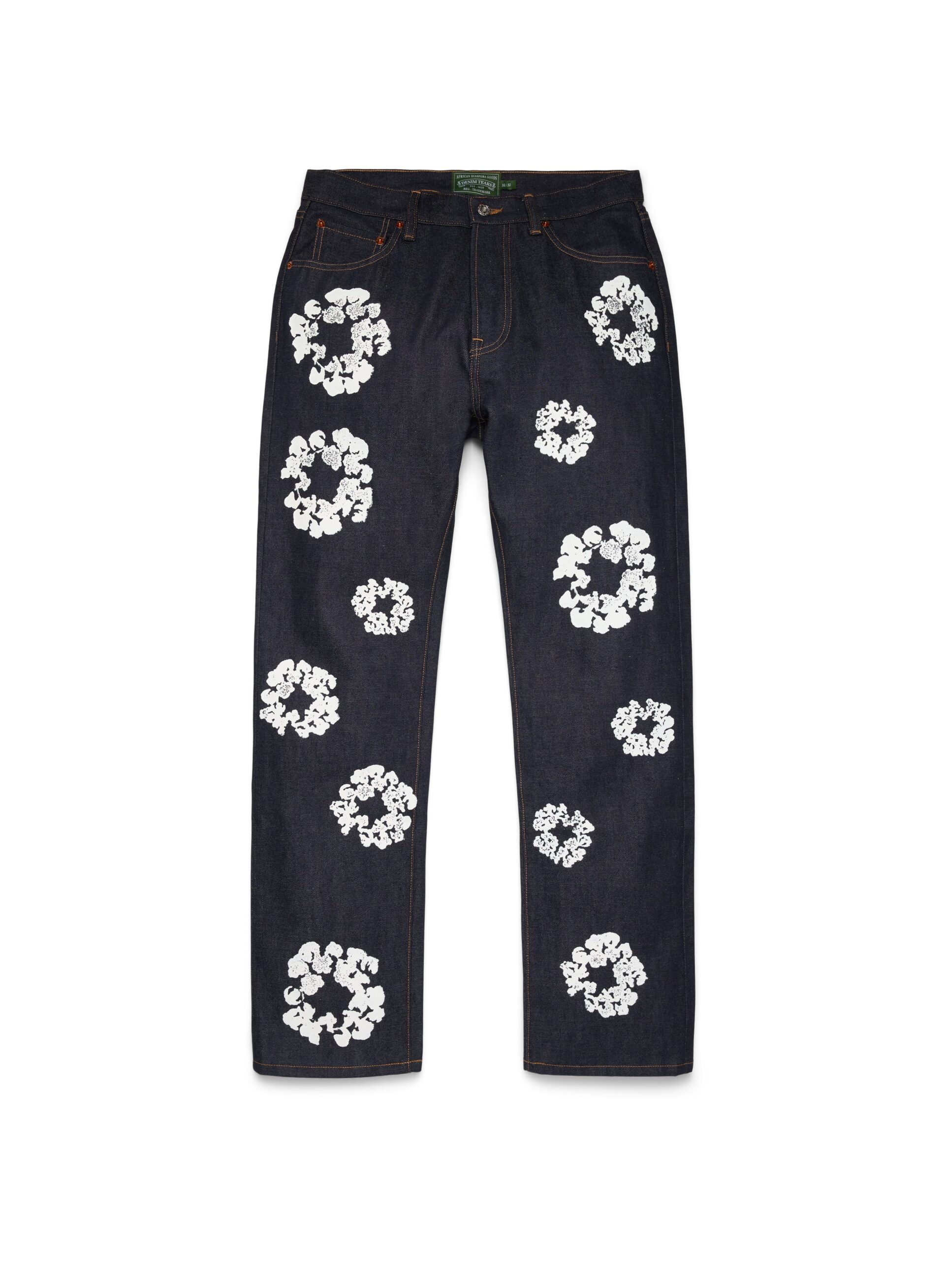 Constructed from mid-weight 14oz Japanese selvedge denim to a classic straight fit, our Straight Selvedge Cotton Wreath Denim Pants are cut, sewn, and washed in the USA for uncompromised quality. Finished with an all-over signature Cotton Wreath print, custom antique nickel shank buttons, and custom brass rivets.