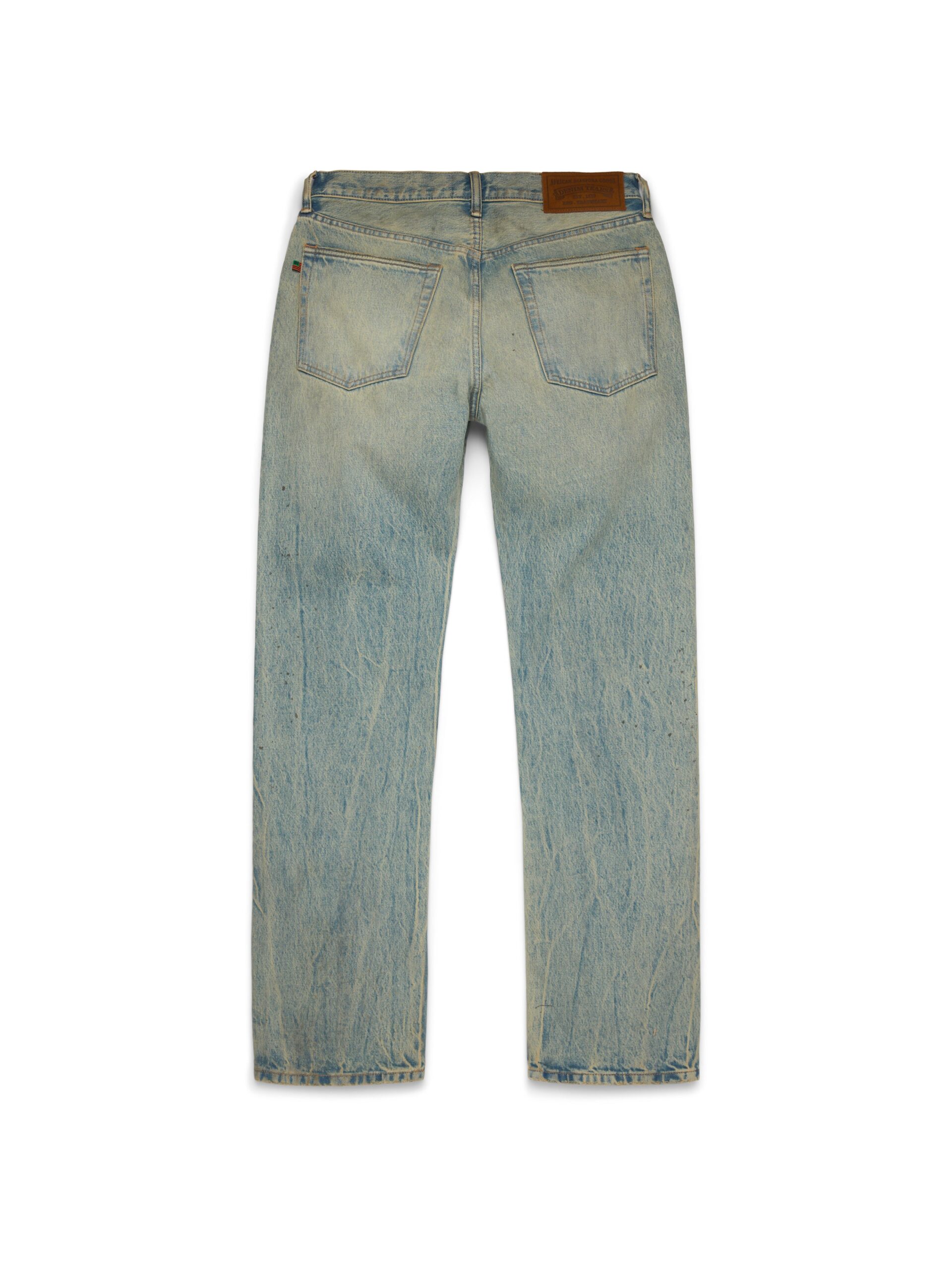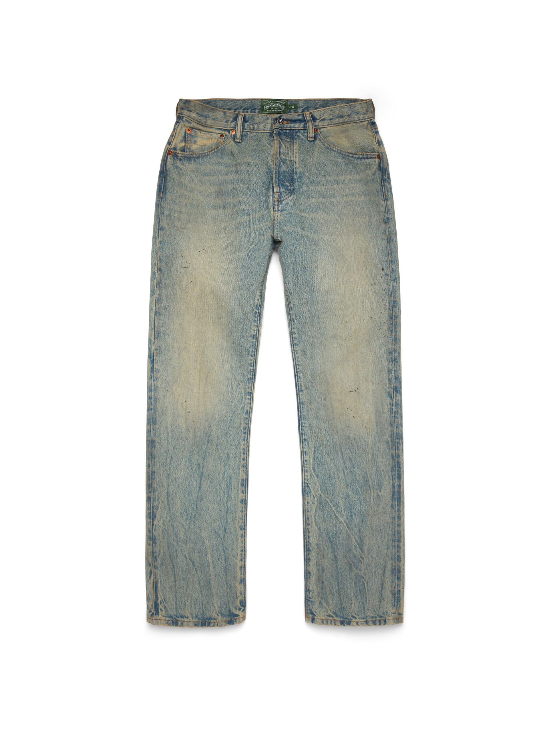 Constructed from heavyweight 14oz denim to a classic straight fit, our Dirty Wash Straight Leg Denim Jeans are cut, sewn, and washed in the USA for uncompromised quality. Finished with custom antique nickel shank buttons and custom brass rivets.