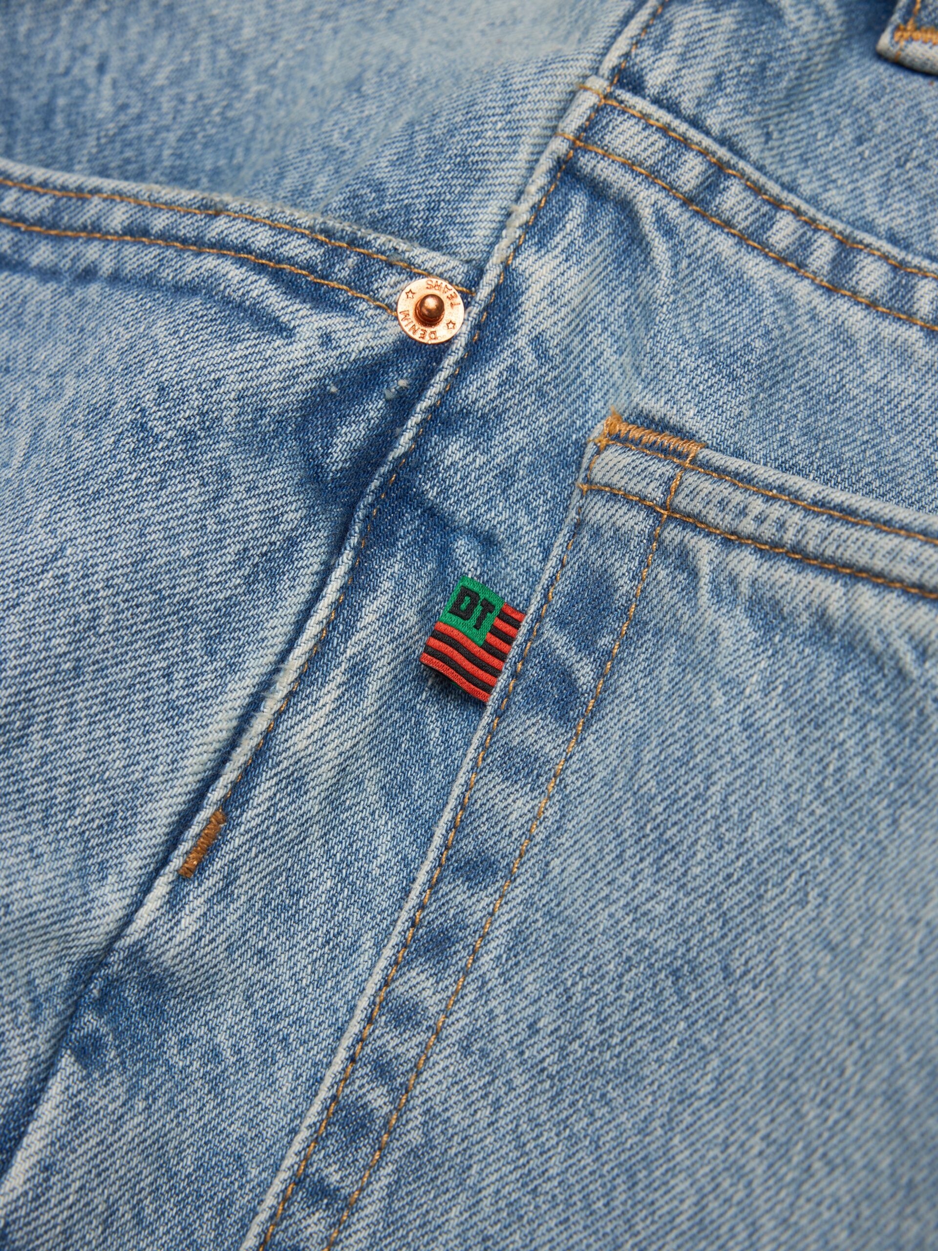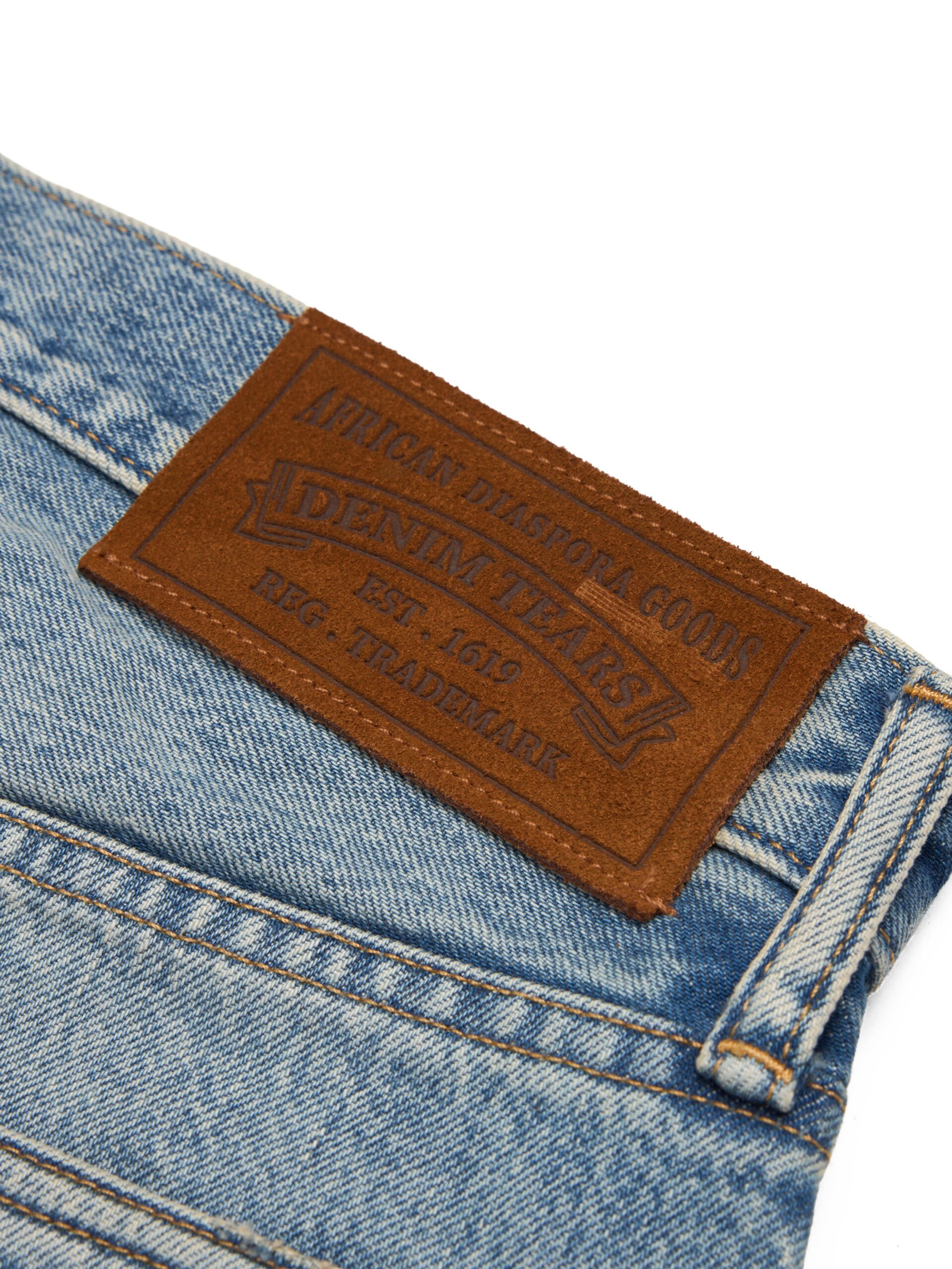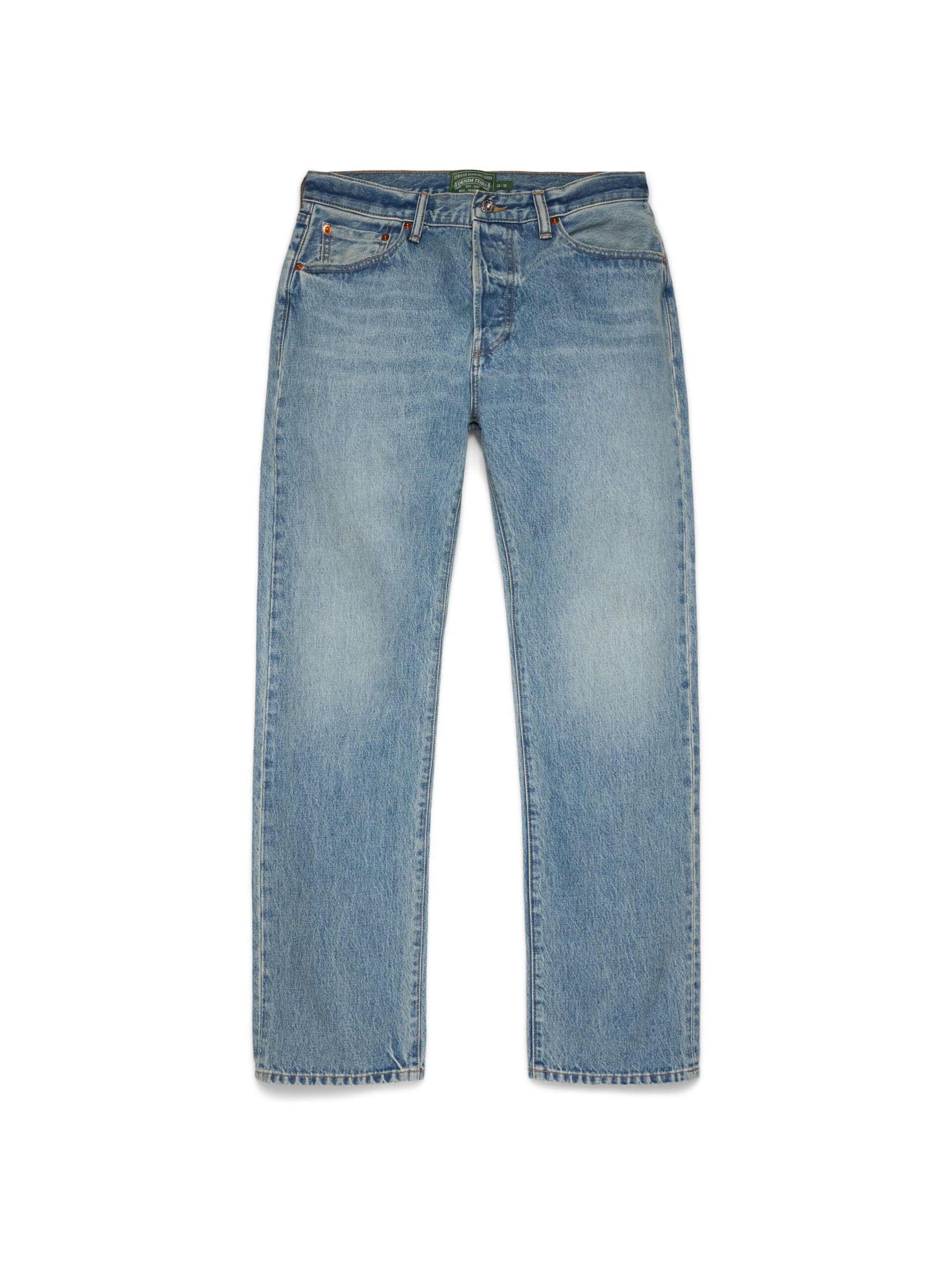 Constructed from heavyweight 14oz denim to a classic straight fit, our Light Wash Straight Leg Denim Jeans are cut, sewn, and washed in the USA for uncompromised quality. Finished with custom antique nickel shank buttons and custom brass rivets.